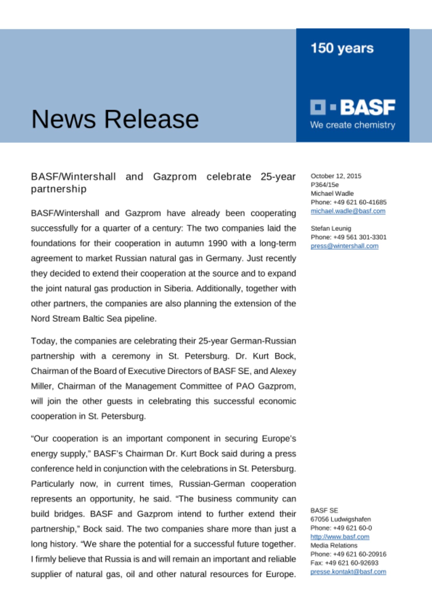 Today, the companies are celebrating their 25-year German-Russian partnership with a ceremony in St. Petersburg. Dr. Kurt Bock, Chairman of the Board of Executive Directors of BASF SE, and Alexey Miller, Chairman of the Management Committee of PAO Gazprom, will join the other guests in celebrating this successful economic cooperation in St. Petersburg.