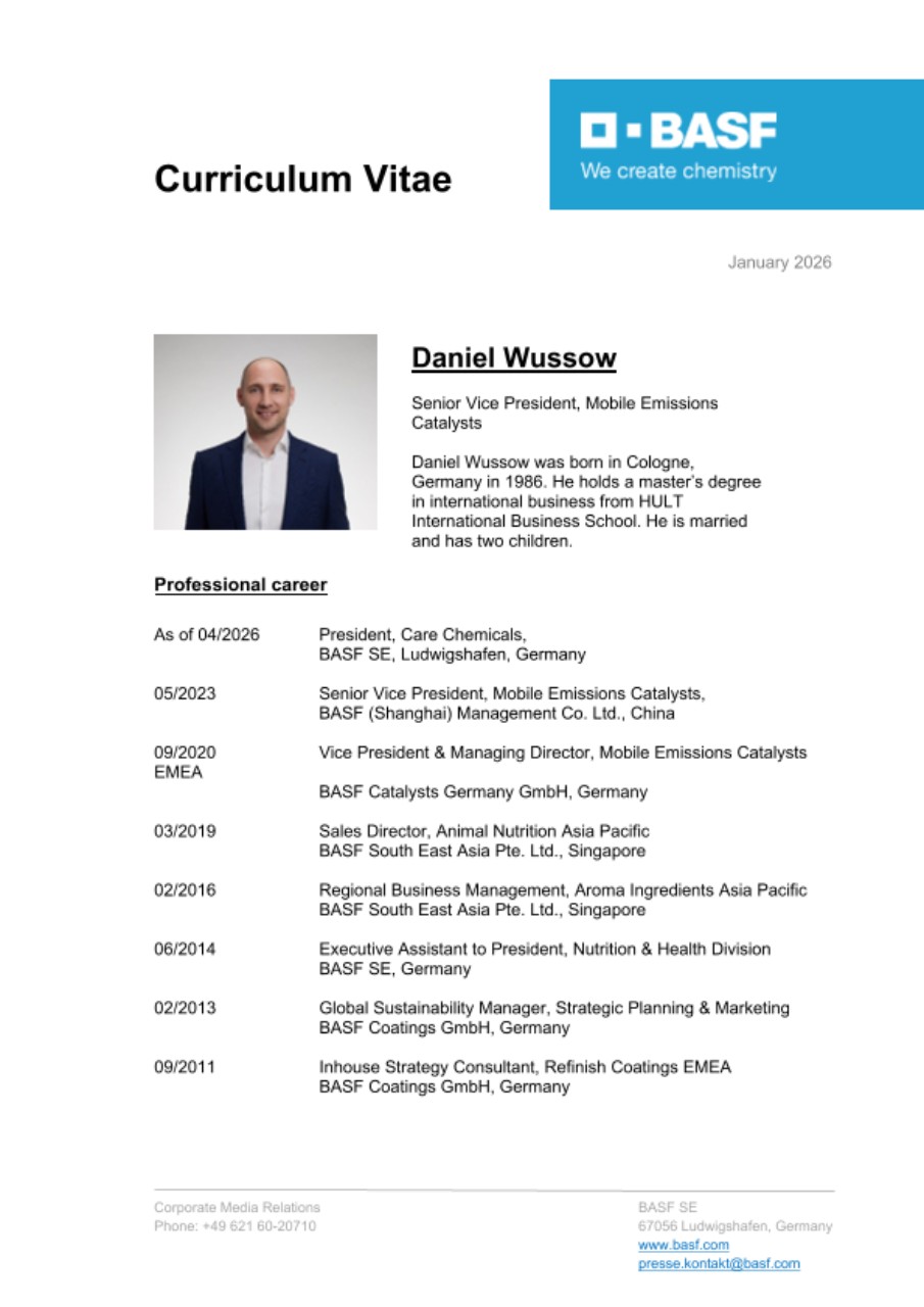Daniel Wussow (39), Senior Vice President, Mobile Emissions Catalysts at BASF (Shanghai) Management Co. Ltd., Shanghai, will, as President, assume responsibility for the Division Care Chemicals, based in Ludwigshafen, Germany, effective April 1, 2026. He will succeed Dr. Mary Kurian (48), who was appointed as Member of the Board of Executive Directors.