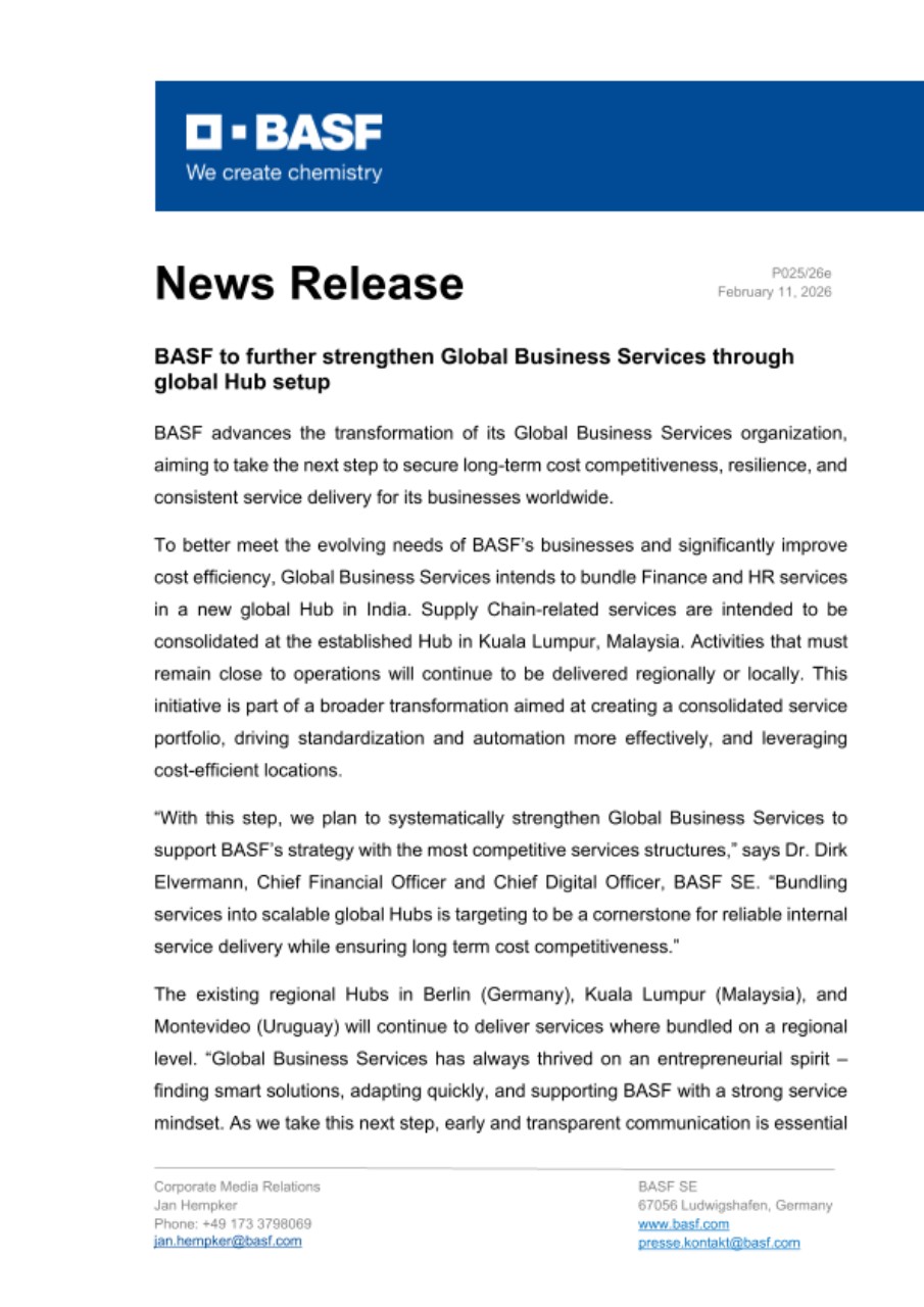 To better meet the evolving needs of BASF’s businesses and significantly improve cost efficiency, Global Business Services intends to bundle Finance and HR services in a new global Hub in India. Supply Chain-related services are intended to be consolidated at the established Hub in Kuala Lumpur, Malaysia. Activities that must remain close to operations will continue to be delivered regionally or locally. This initiative is part of a broader transformation aimed at creating a consolidated service portfolio, driving standardization and automation more effectively, and leveraging cost-efficient locations.