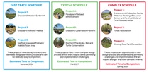 Since the execution of the Settlement Agreement, BASF has conducted preliminary design studies, solicited input from the public, and collected feedback from the NJDEP on the nine ecological restoration projects. As presented in the Scope of Work found as Appendix B of the Settlement Agreement, some of the projects are more complex than others. Therefore, the nine projects were broken up and placed into three categories based on their level of effort (Fast Track, Typical, and Complex). Based on the feedback, select projects were redefined and re-categorized into the three categories. The revised schedule is shown below.