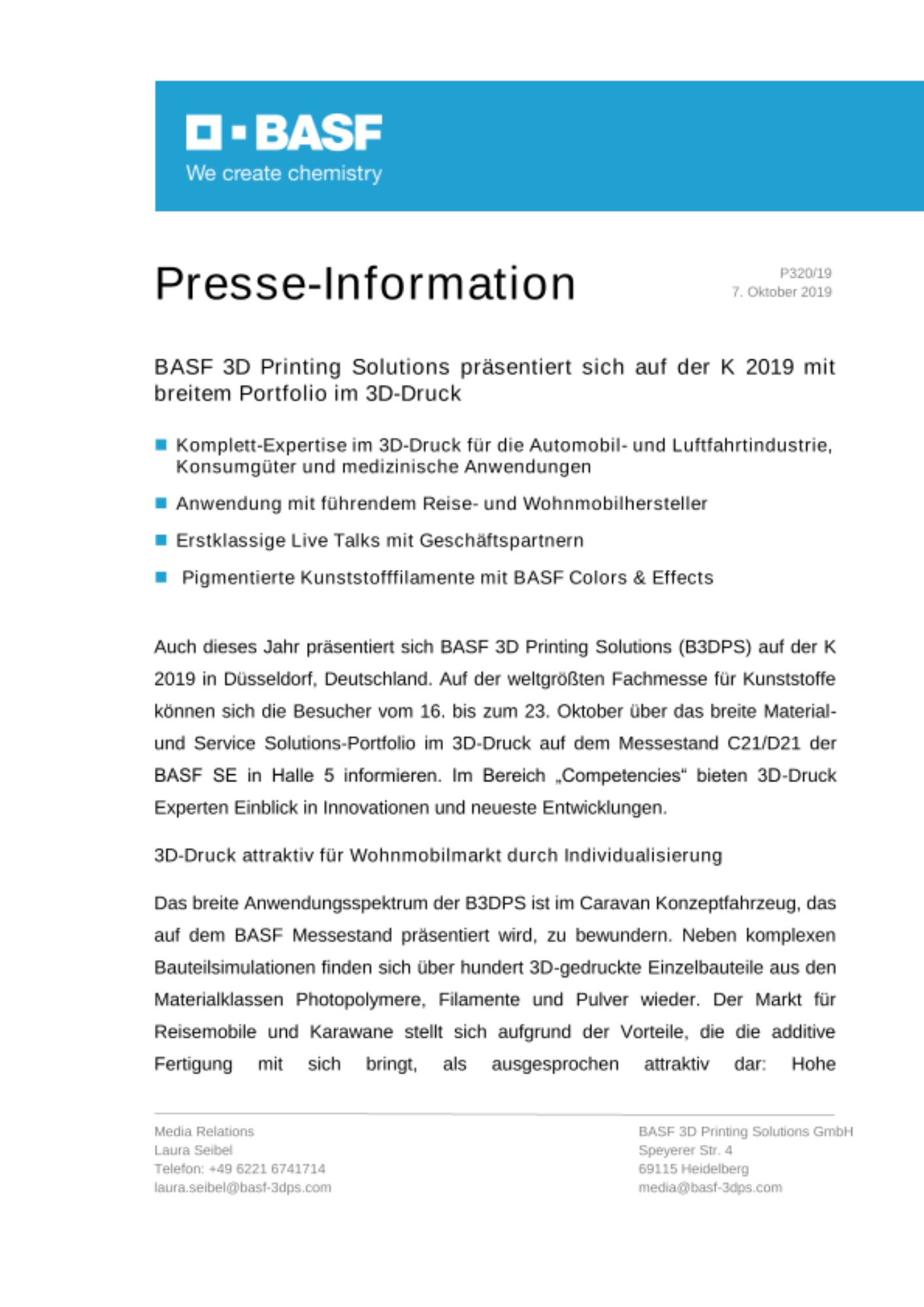 Auch dieses Jahr präsentiert sich BASF 3D Printing Solutions (B3DPS) auf der K 2019 in Düsseldorf, Deutschland. Auf der weltgrößten Fachmesse für Kunststoffe können sich die Besucher vom 16. bis zum 23. Oktober über das breite Material- und Service Solutions-Portfolio im 3D-Druck auf dem Messestand C21/D21 der BASF SE in Halle 5 informieren. Im Bereich „Competencies“ bieten 3D-Druck Experten Einblick in Innovationen und neueste Entwicklungen.