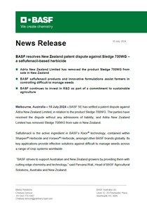 Melbourne, Australia – 10 July 2024 – BASF SE has settled a patent dispute against Adria New Zealand Limited, in relation to the product Sledge 700WG. The parties have resolved the dispute without any admissions of liability, and Adria New Zealand Limited has removed Sledge 700WG from sale in New Zealand.