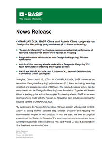 CHINAPLAS 2024: BASF China and Autoliv China cooperate on ‘Design-for-Recycling’ polyurethanes (PU) foam technology