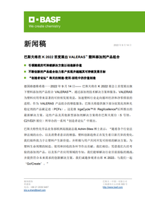 德国路德维希港——2022 年 9 月 14 日—— 巴斯夫将在 K 2022 展会上首度展出旗下塑料添加剂产品组合 VALERAS™。通过添加剂技术解决方案和服务,VALERAS 为塑料应用带来显著的可持续发展效益,加速塑料行业走向循环经济和净零排放的进程。作为 VALERAS 产品组合的增值服务,巴斯夫将提供旗下部分抗氧化剂和光稳定剂的产品碳足迹(PCFs),这是继 IrgaCycle™ 和 RegXcellence® 后所推出的最新解决方案。这些产品及其他新型添加剂解决方案将在巴斯夫展台(5 号馆,C21/D21 展位)所举办的一系列“创造者论坛”中展出。