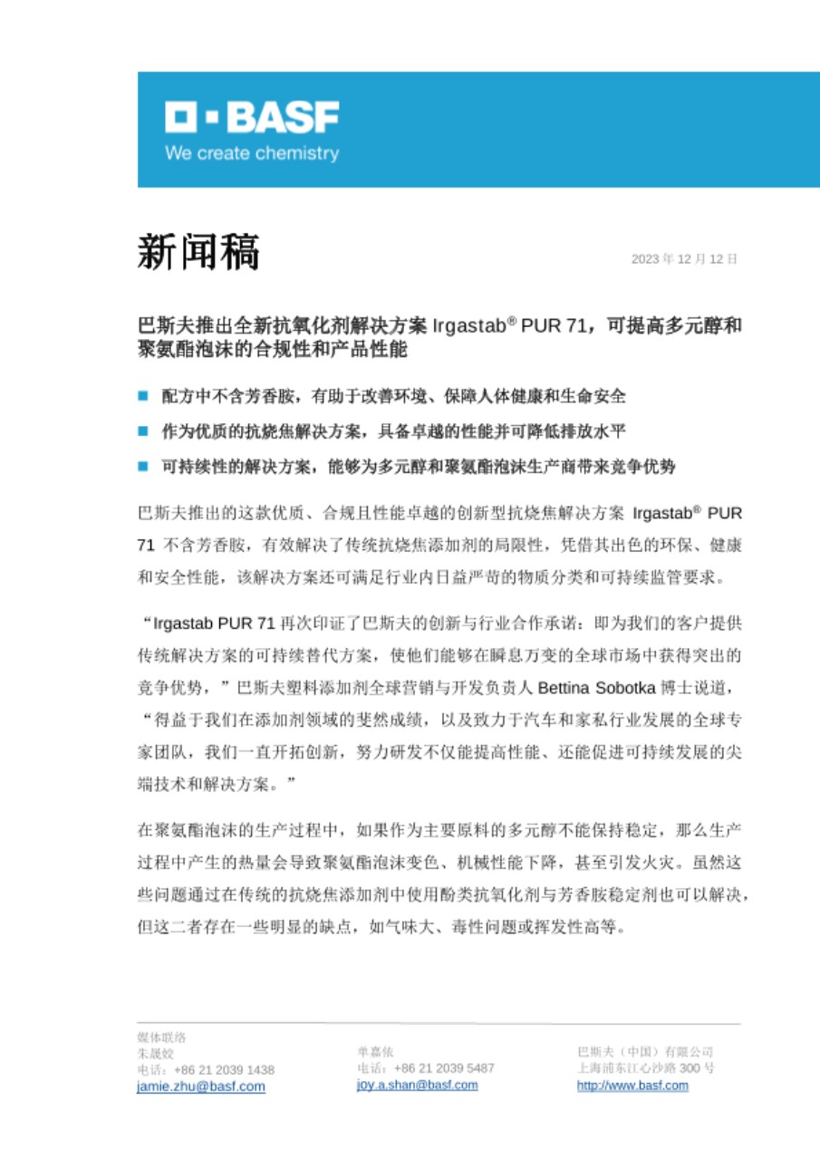 巴斯夫推出全新抗氧化剂解决方案 Irgastab® PUR 71,可提高多元醇和聚氨酯泡沫的合规性和产品性能
