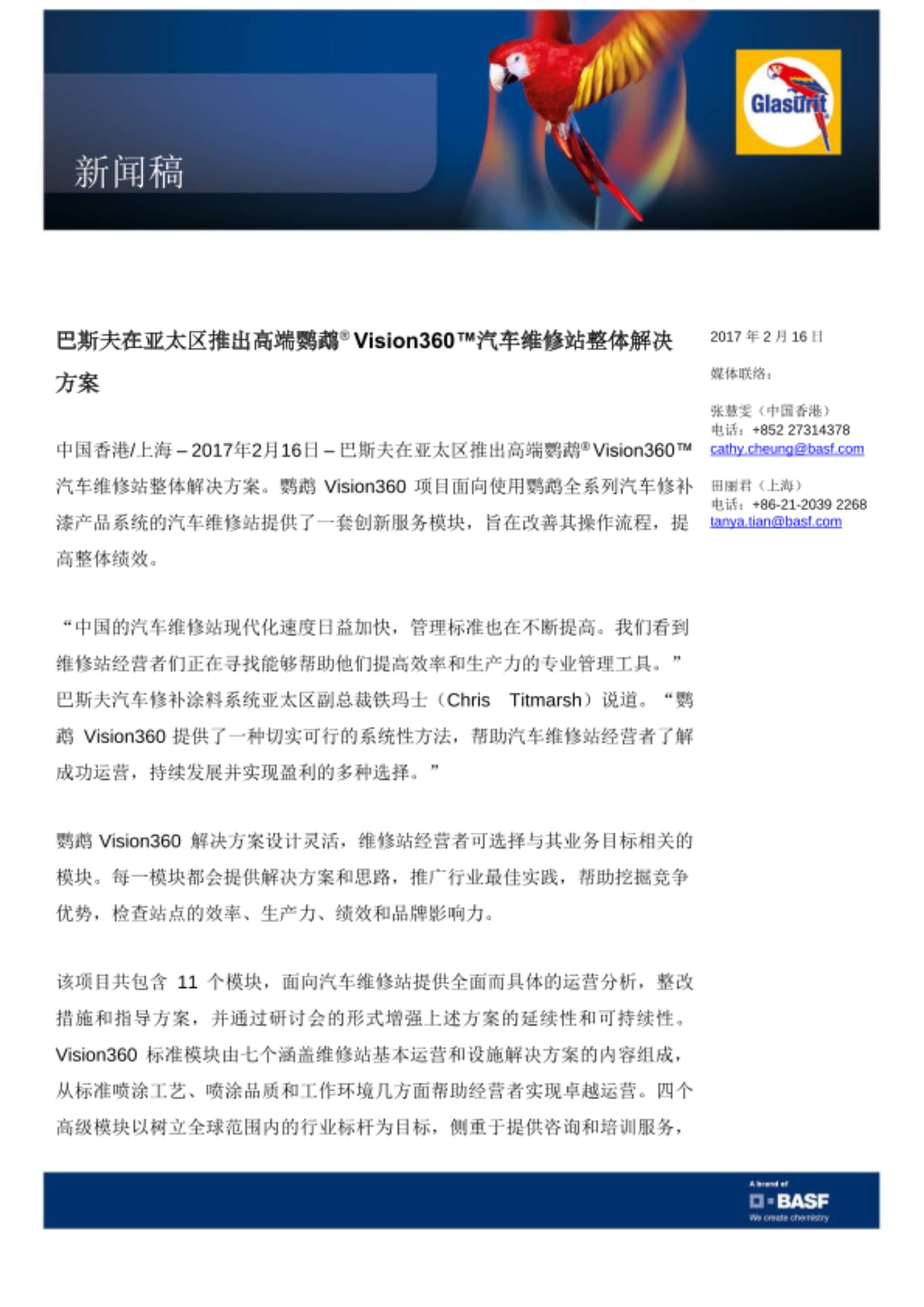 中国香港/上海 – 2017年2月16日 – 巴斯夫在亚太区推出高端鹦鹉® Vision360™汽车维修站整体解决方案。鹦鹉 Vision360 项目面向使用鹦鹉全系列汽车修补漆产品系统的汽车维修站提供了一套创新服务模块,旨在改善其操作流程,提高整体绩效。