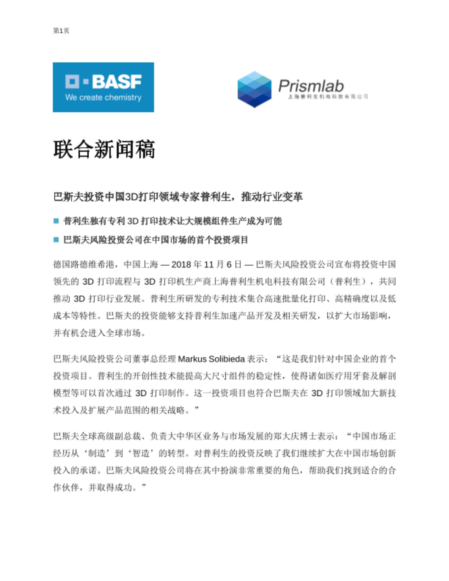 德国路德维希港,中国上海 — 2018年11月6日 — 巴斯夫风险投资公司宣布将投资中国领先的3D打印流程与3D打印机生产商上海普利生机电科技有限公司(普利生),共同推动3D打印行业发展。普利生所研发的专利技术集合高速批量化打印、高精确度以及低成本等特性。巴斯夫的投资能够支持普利生加速产品开发及相关研发,以扩大市场影响,并有机会进入全球市场。