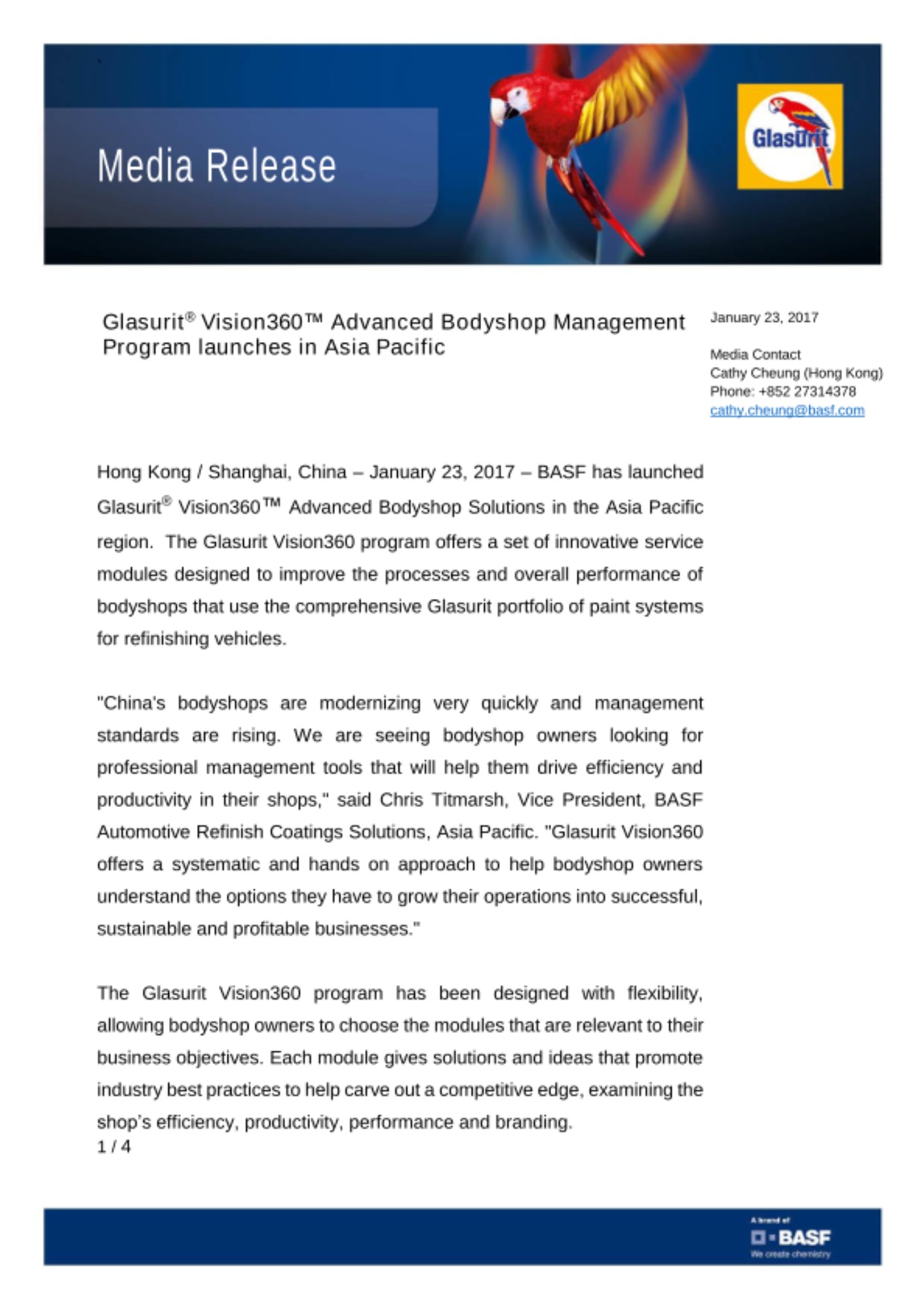 "China's bodyshops are modernizing very quickly and management standards are rising. We are seeing bodyshop owners looking for professional management tools that will help them drive efficiency and productivity in their shops," said Chris Titmarsh, Vice President, BASF Automotive Refinish Coatings Solutions, Asia Pacific. "Glasurit Vision360 offers a systematic and hands on approach to help bodyshop owners understand the options they have to grow their operations into successful, sustainable and profitable businesses."