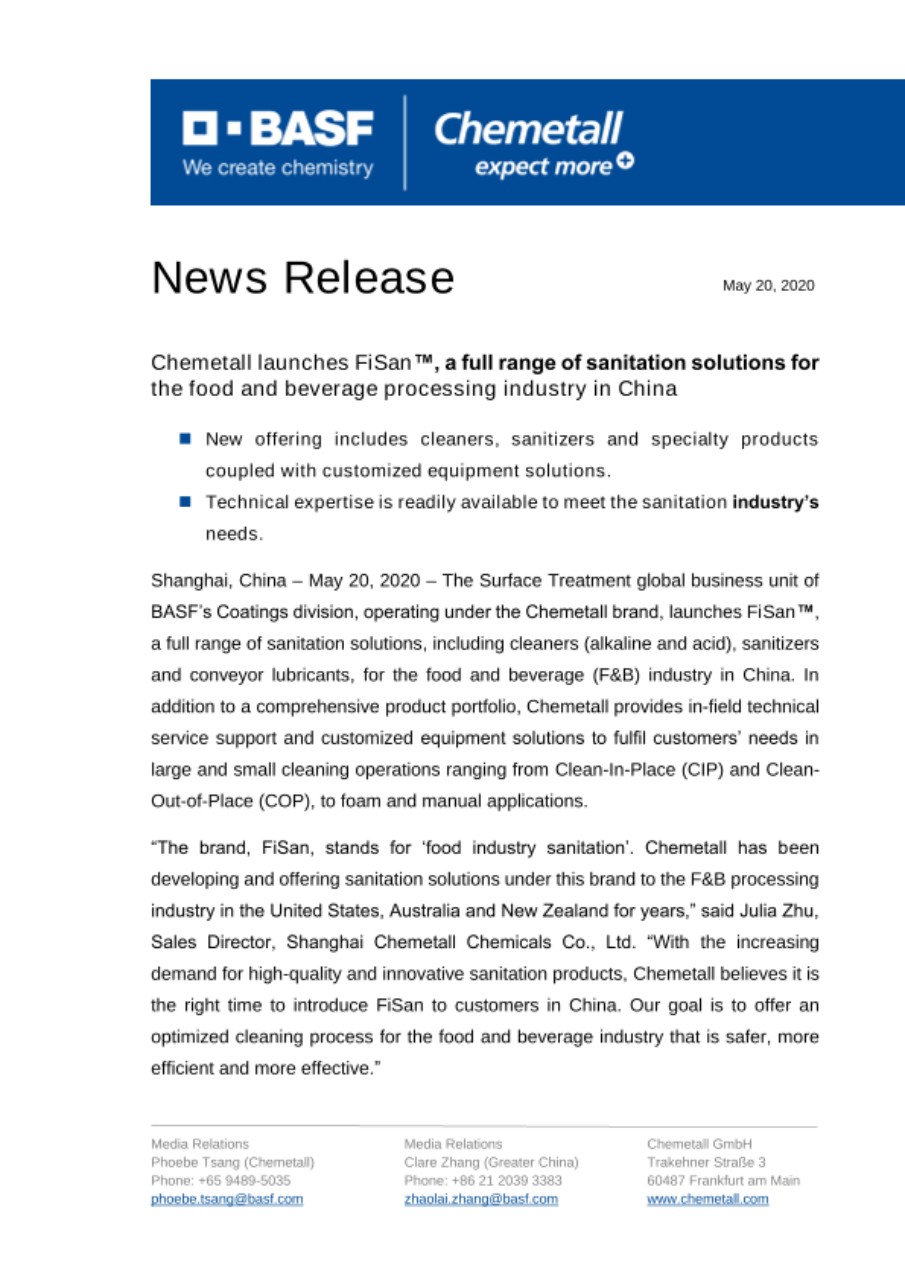 “The brand, FiSan, stands for ‘food industry sanitation’. Chemetall has been developing and offering sanitation solutions under this brand to the F&B processing industry in the United States, Australia and New Zealand for years,” said Julia Zhu, Sales Director, Shanghai Chemetall Chemicals Co., Ltd. “With the increasing demand for high-quality and innovative sanitation products, Chemetall believes it is the right time to introduce FiSan to customers in China. Our goal is to offer an optimized cleaning process for the food and beverage industry that is safer, more efficient and more effective.”