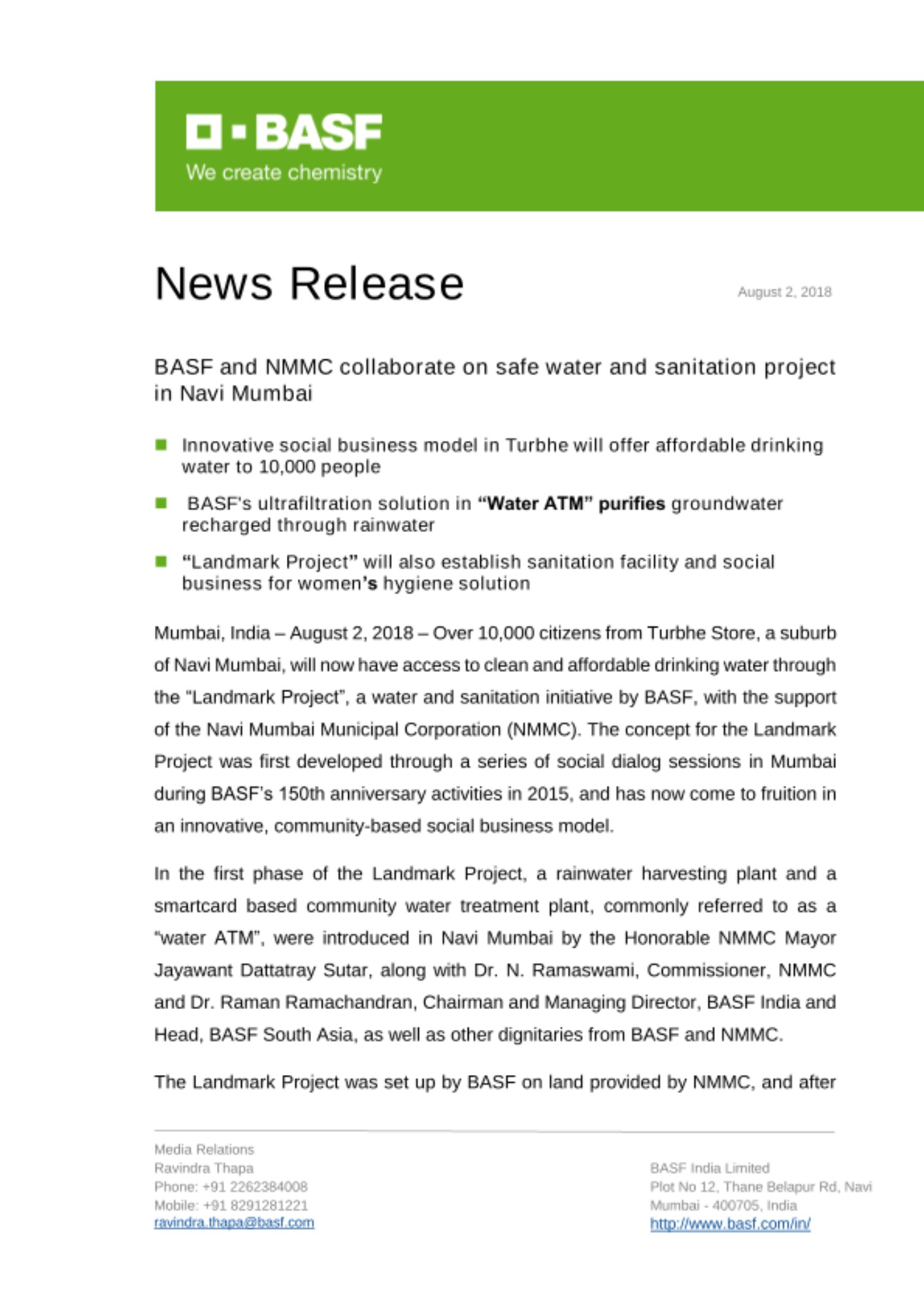 Jayawant Dattatray Sutar, Honorable NMMC Mayor said, “As a planned urban center, Navi Mumbai has seen tremendous growth in the last few years and it is our duty to offer holistic and sustainable services that elevate living standards of our citizens. I am very happy to see this joint effort between the NMMC and BASF, which will offer clean drinking water to the residents of Turbhe Store.”