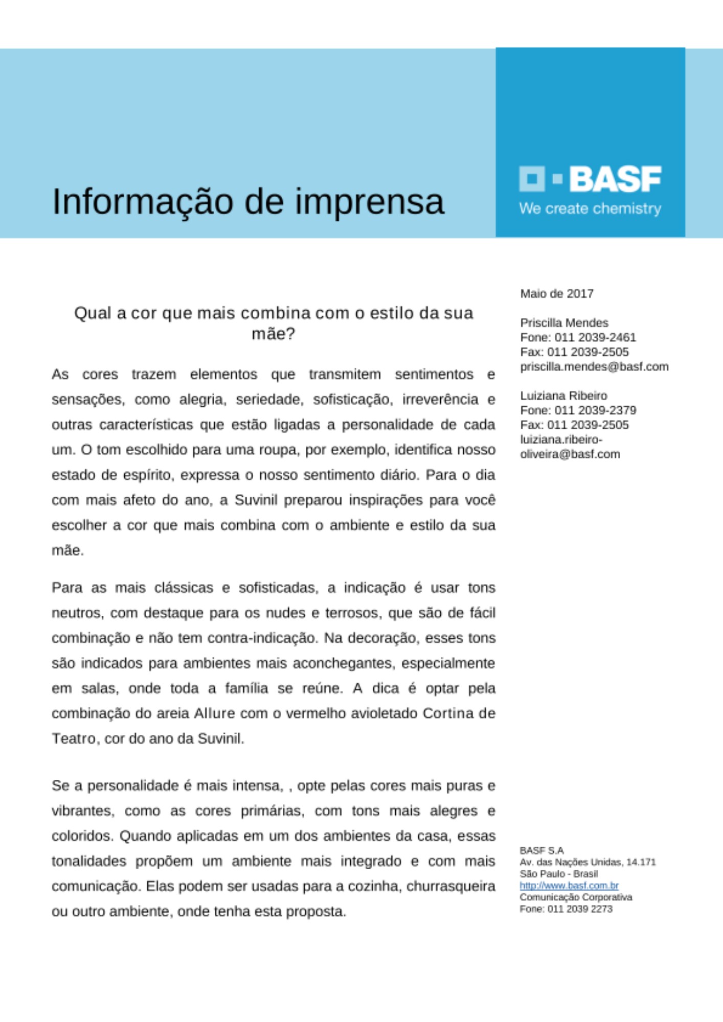 As cores trazem elementos que transmitem sentimentos e sensações, como alegria, seriedade, sofisticação, irreverência e outras características que estão ligadas a personalidade de cada um. O tom escolhido para uma roupa, por exemplo, identifica nosso estado de espírito, expressa o nosso sentimento diário. Para o dia com mais afeto do ano, a Suvinil preparou inspirações para você escolher a cor que mais combina com o ambiente e estilo da sua mãe.