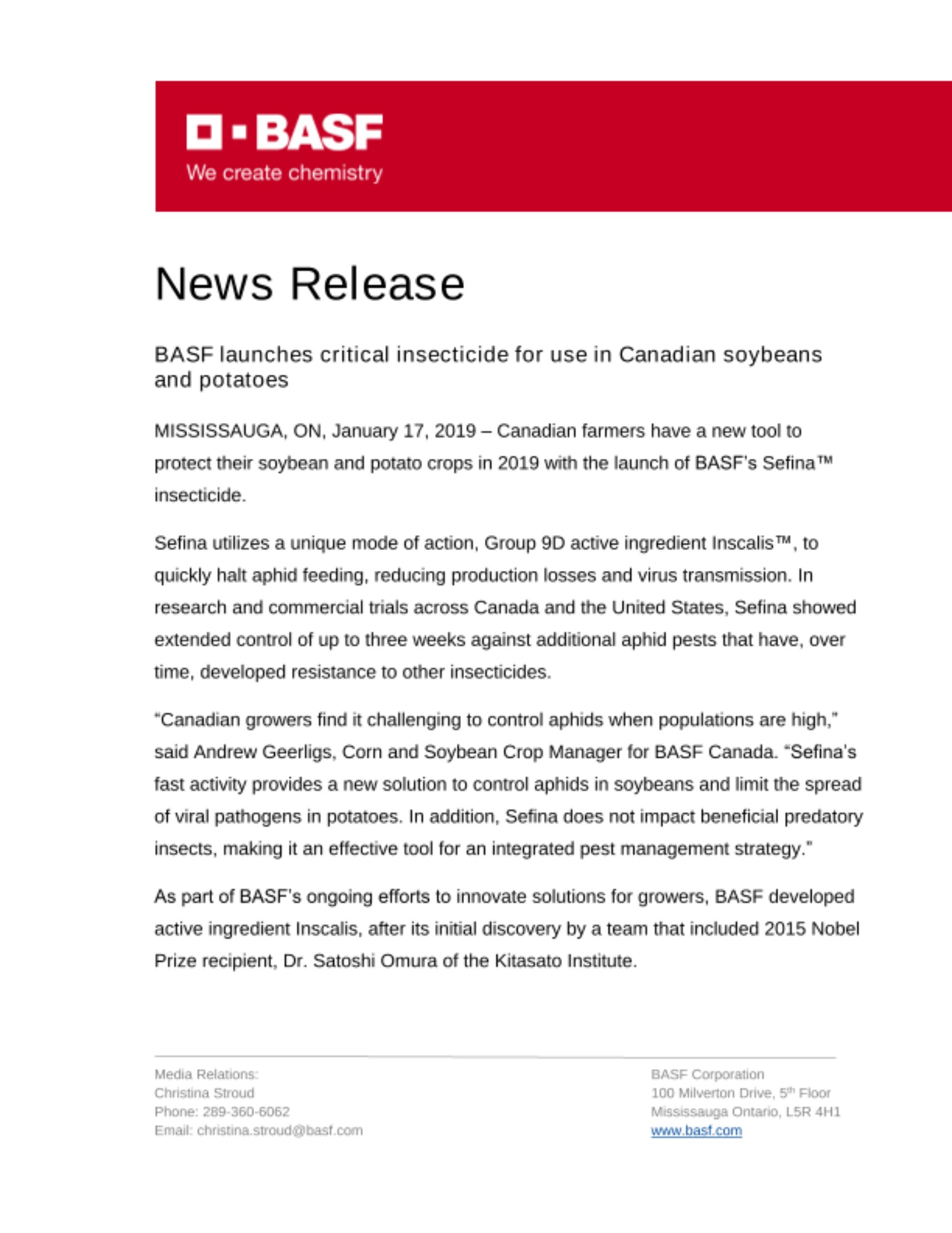 MISSISSAUGA, ON, January 17, 2019 – Canadian farmers have a new tool to protect their soybean and potato crops in 2019 with the launch of BASF’s Sefina™ insecticide.