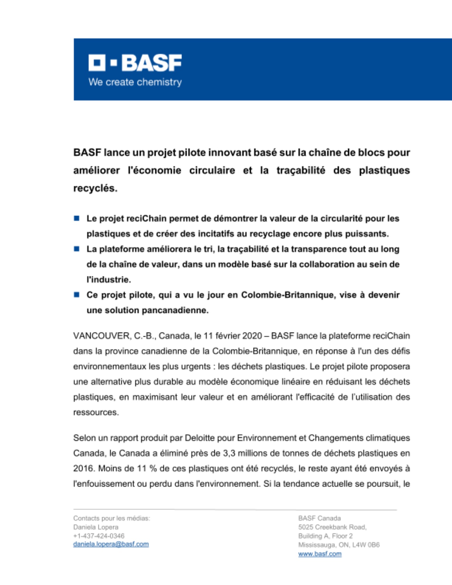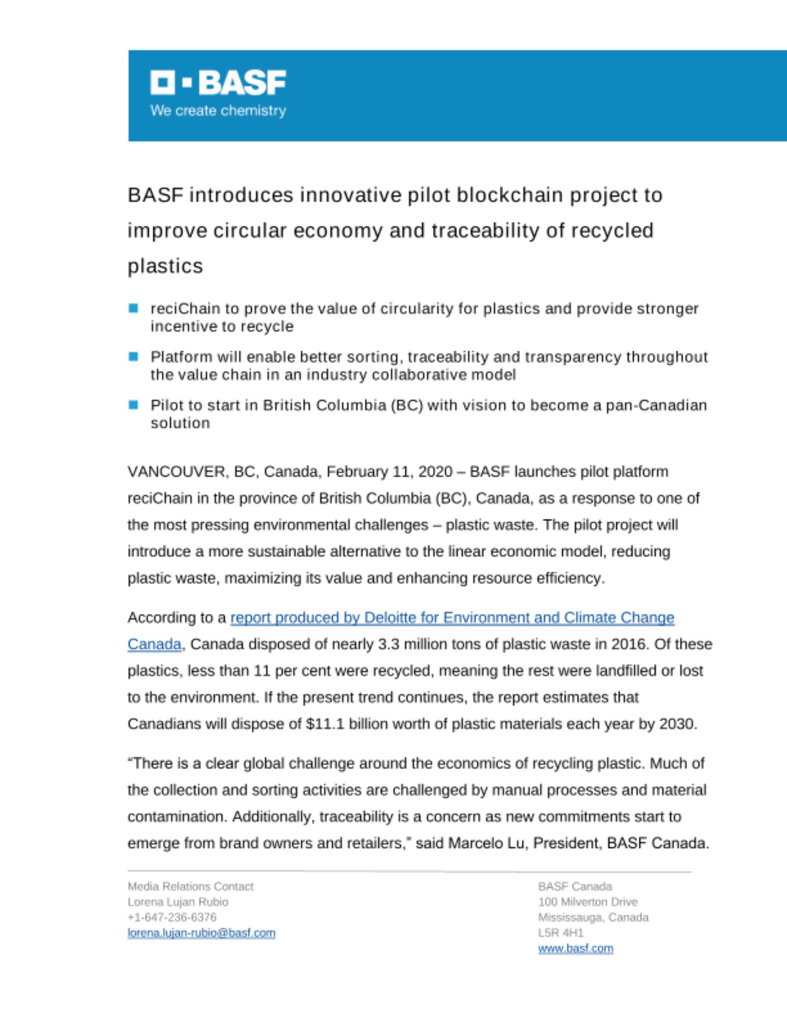VANCOUVER, BC, Canada, February 11, 2020 – BASF launches pilot platform reciChain in the province of British Columbia (BC), Canada, as a response to one of the most pressing environmental challenges – plastic waste. The pilot project will introduce a more sustainable alternative to the linear economic model, reducing plastic waste, maximizing its value and enhancing resource efficiency.