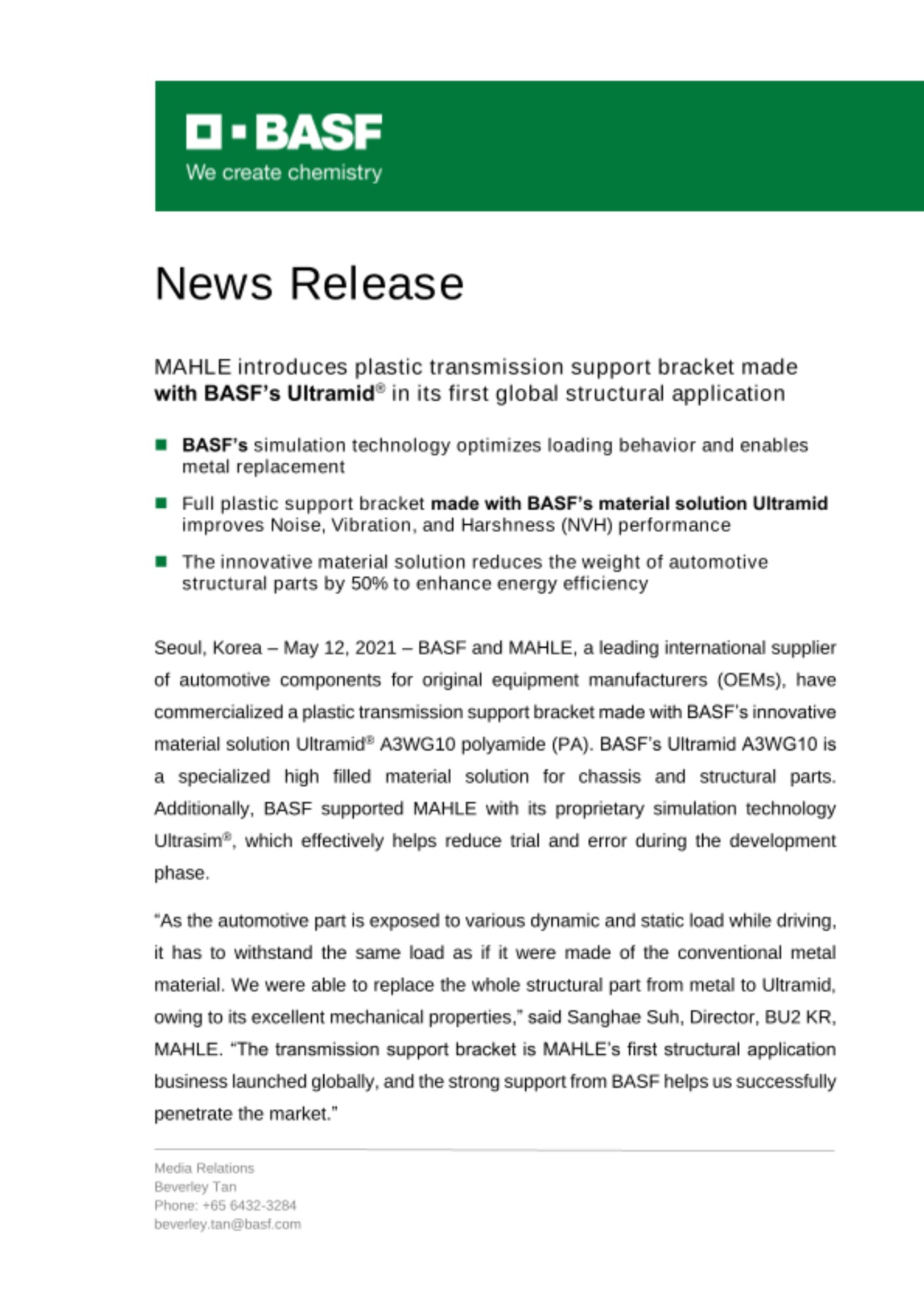 Seoul, Korea – May 12, 2021 – BASF and MAHLE, a leading international supplier of automotive components for original equipment manufacturers (OEMs), have commercialized a plastic transmission support bracket made with BASF’s innovative material solution Ultramid® A3WG10 polyamide (PA). BASF’s Ultramid A3WG10 is a specialized high filled material solution for chassis and structural parts. Additionally, BASF supported MAHLE with its proprietary simulation technology Ultrasim®, which effectively helps reduce trial and error during the development phase.