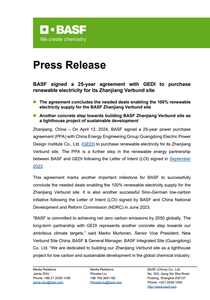 - The agreement concludes the needed deals enabling the 100% renewable electricity supply for the BASF Zhanjiang Verbund site