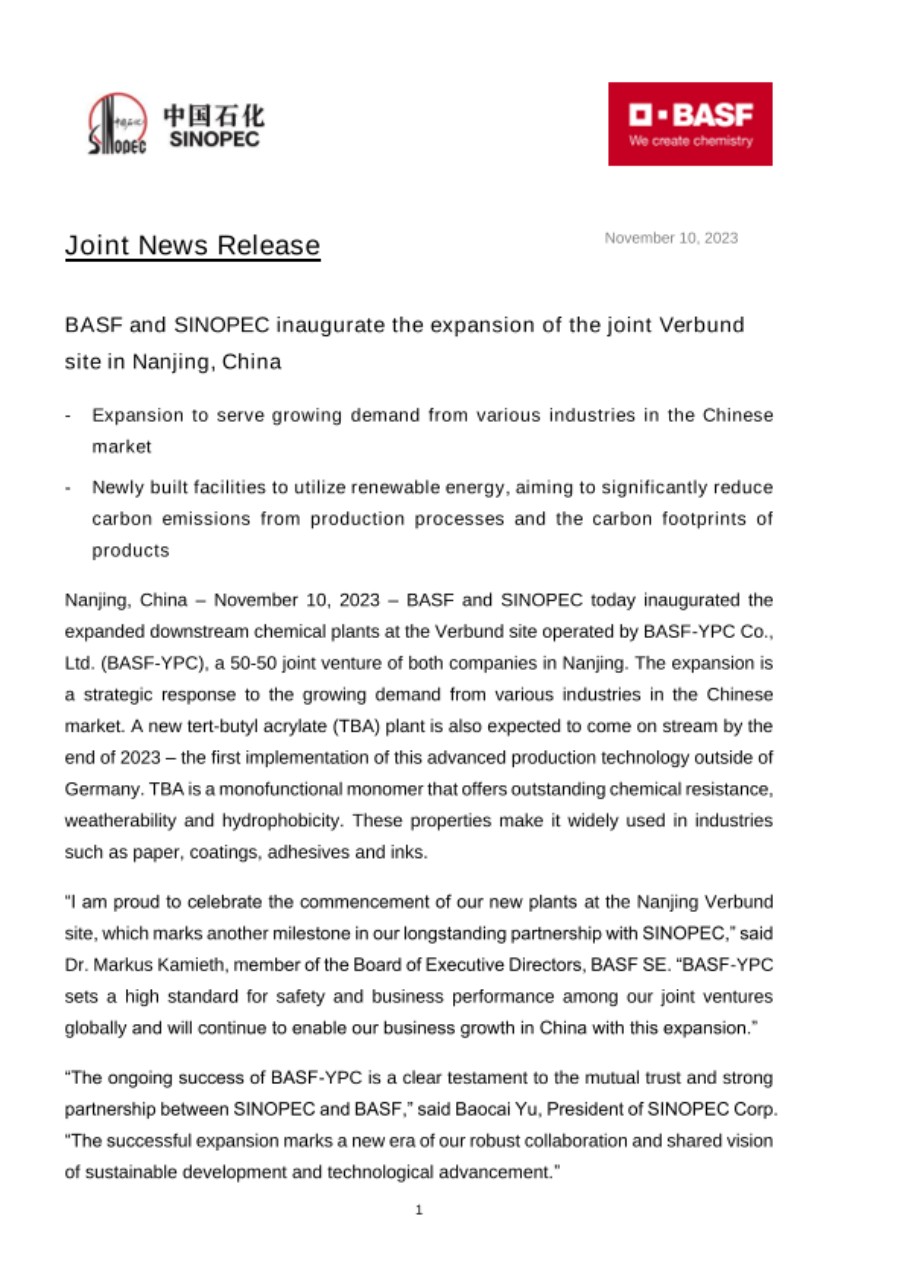 Nanjing, China – November 10, 2023 – BASF and SINOPEC today inaugurated the expanded downstream chemical plants at the Verbund site operated by BASF-YPC Co., Ltd. (BASF-YPC), a 50-50 joint venture of both companies in Nanjing. The expansion is a strategic response to the growing demand from various industries in the Chinese market. A new tert-butyl acrylate (TBA) plant is also expected to come on stream by the end of 2023 – the first implementation of this advanced production technology outside of Germany. TBA is a monofunctional monomer that offers outstanding chemical resistance, weatherability and hydrophobicity. These properties make it widely used in industries such as paper, coatings, adhesives and inks.
