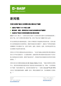 在巴斯夫,我们创造化学新作用——追求可持续发展的未来。我们将经济上的成功、社会责任和环境保护相结合。巴斯夫在全球拥有超过 111,000 名员工,为几乎所有国家、所有行业的客户成功作出贡献。我们的产品分属六大业务领域:化学品、材料、工业解决方案、表面处理技术、营养与护理、农业解决方案。2022 年巴斯夫全球销售额为 873 亿欧元。巴斯夫的股票在法兰克福(BAS)证券交易所上市,并以美国存托凭证(BASFY)的形式在美国证券市场交易。欲了解更多信息,请访问:www.basf.com