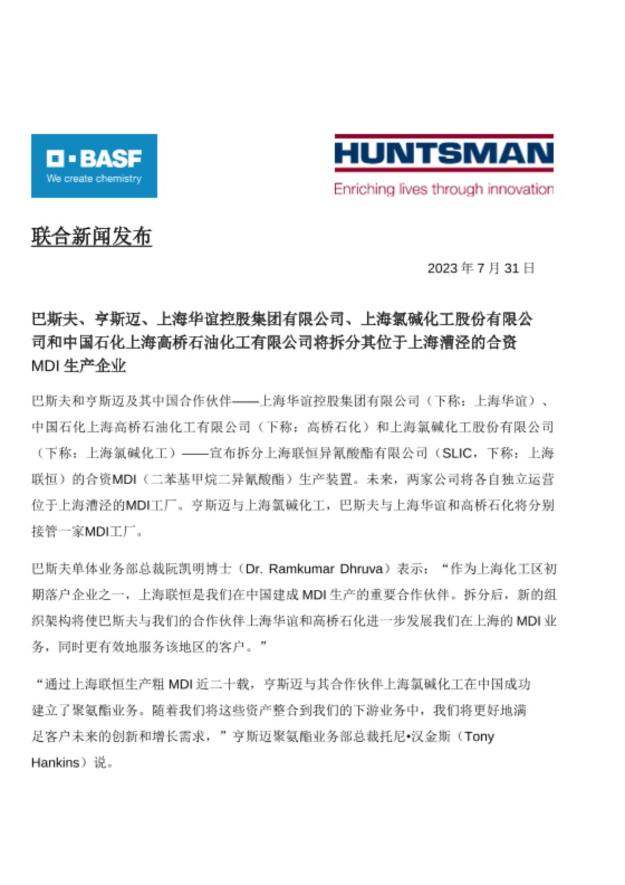 巴斯夫、亨斯迈、上海华谊控股集团有限公司、上海氯碱化工股份有限公司和中国石化上海高桥石油化工有限公司将拆分其位于上海漕泾的合资 MDI 生产企业