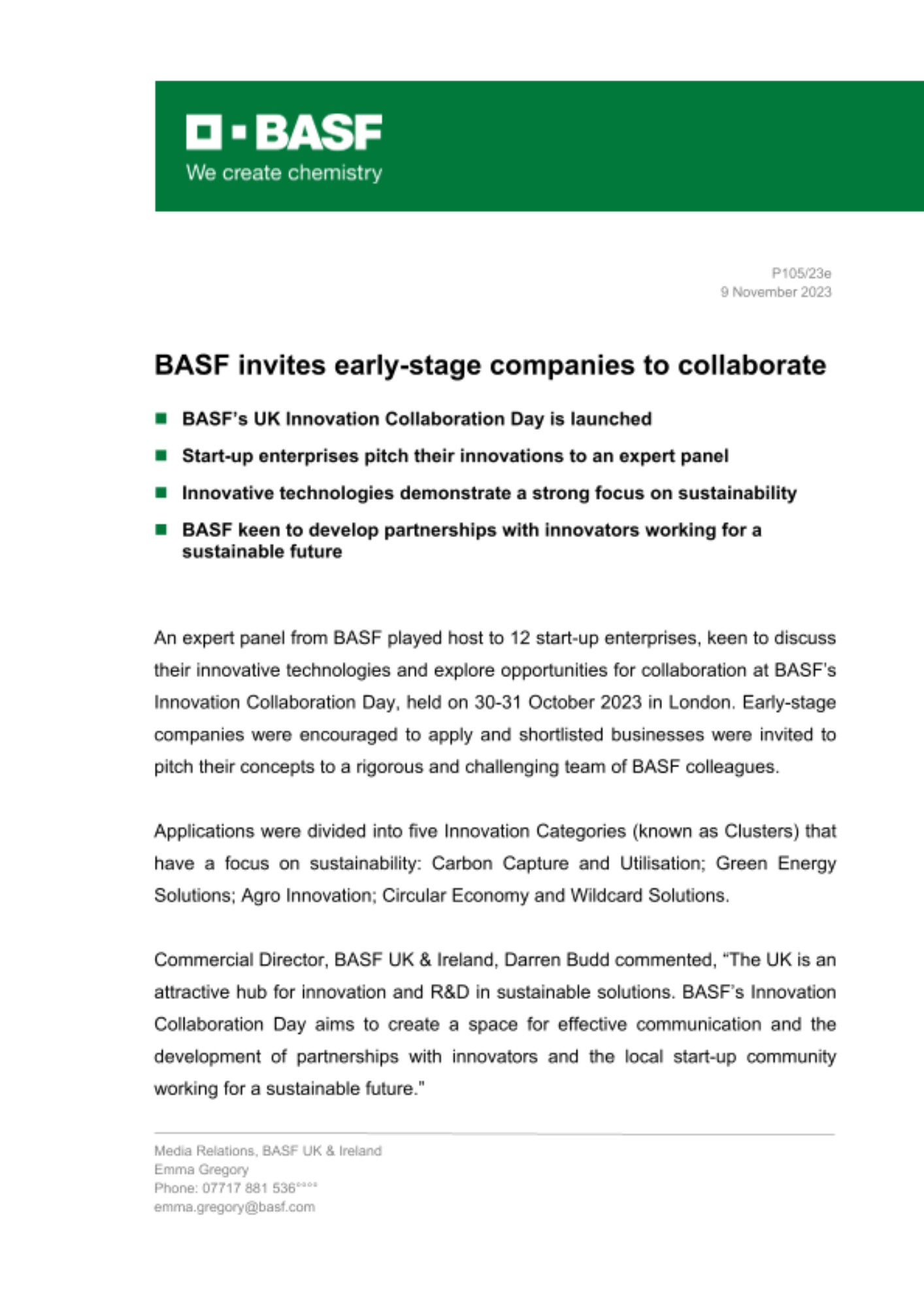 Commercial Director, BASF UK & Ireland, Darren Budd commented, “The UK is an attractive hub for innovation and R&D in sustainable solutions. BASF’s Innovation Collaboration Day aims to create a space for effective communication and the development of partnerships with innovators and the local start-up community working for a sustainable future.”