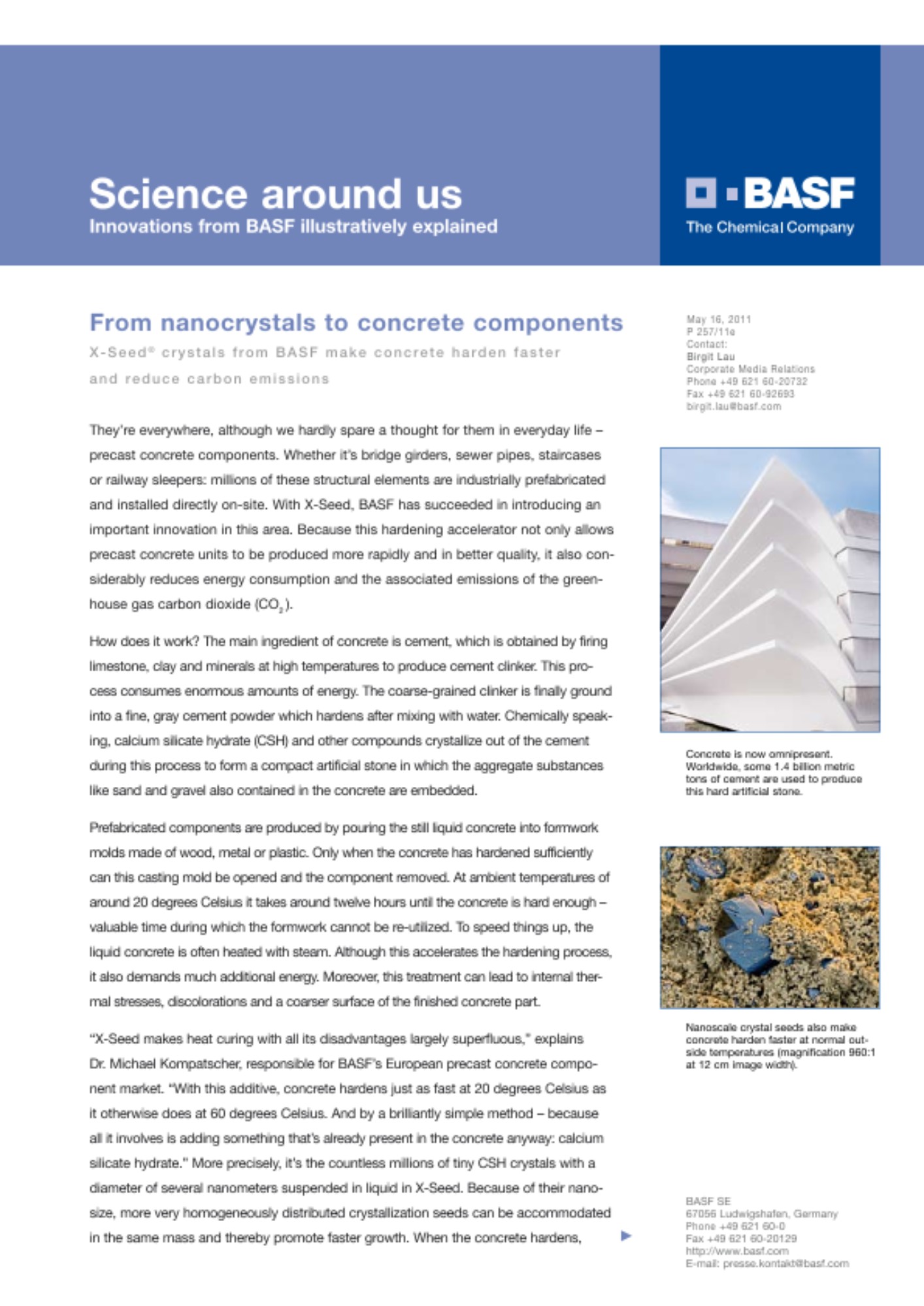 In addition to BASF's internal Seebalance analysis, together with the Freiburg Ecoinstitute the company has tested a completely new method for evaluating the sustainability of nanoproduction using X-Seed as an example. This "nanosustainability check" also demonstrated that X-Seed can contribute decisively to sustainable construction with concrete.