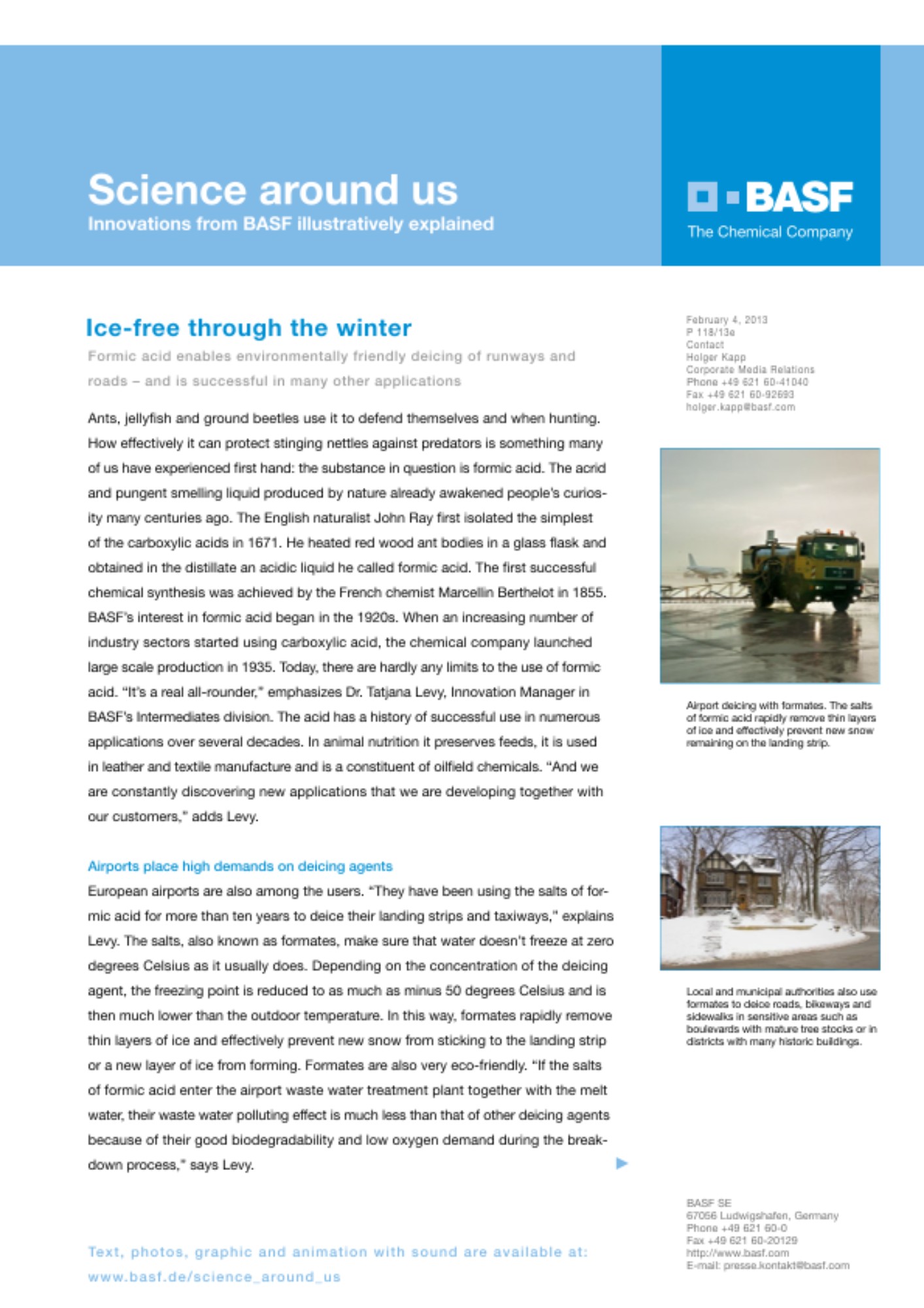 European airports are also among the users. "They have been using the salts of formic acid for more than ten years to deice their landing strips and taxiways," explains Levy. The salts, also known as formates, make sure that water doesn't freeze at zero degrees Celsius as it usually does. Depending on the concentration of the deicing agent, the freezing point is reduced to as much as minus 50 degrees Celsius and is then much lower than the outdoor temperature. In this way, formates rapidly remove thin layers of ice and effectively prevent new snow from sticking to the landing strip or a new layer of ice from forming. Formates are also very eco-friendly. "If the salts of formic acid enter the airport waste water treatment plant together with the melt water, their waste water polluting effect is much less than that of other deicing agents because of their good biodegradability and low oxygen demand during the breakdown process," says Levy.