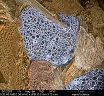 In the Kaurit® Light panel, expanded polymer in the form of foamed beads is added to the middle layer. The beads fill the cavities, form additional binding sites for the wood chips and thereby enhance the panel's strength. They also generate counterpressure during compression, making for high compaction of the outer layers.
