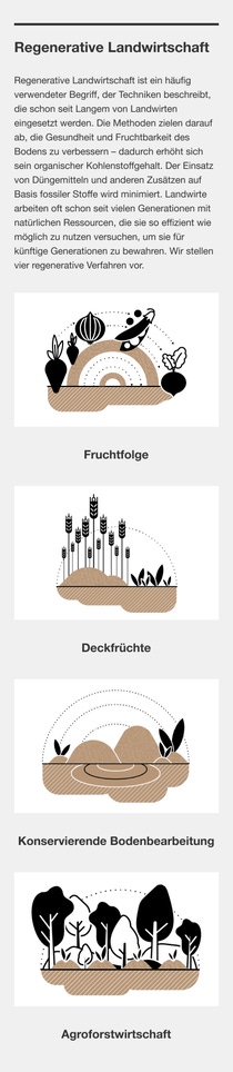 „Und wir sollten einen geringeren Anteil des Bodens selbst nutzen“, fügt er hinzu. Eine geringere Nachfrage nach landwirtschaftlichen Erzeugnissen durch eine effizientere Nutzung und veränderte Ernährungsgewohnheiten würde es ermöglichen, der Natur mehr Land zurückzugeben und so Milliarden Tonnen Kohlenstoff zu binden. In einigen Teilen der Welt sind bereits groß angelegte Projekte zum Schutz des Bodens im Gange. Im Rahmen des Naturschutzprogramms „Grüne Mauer“ in China entsteht der größte von Menschen geschaffene Wald der Erde. Nach Abschluss in den 2050er-Jahren soll er sich über 4.500 Kilometer erstrecken und das Vordringen der Wüste Gobi nach Süden verlangsamen. Die meisten Regionen verfügen jedoch nicht über die erforderlichen politischen, gesellschaftlichen oder wirtschaftlichen Strukturen, um solch weitreichende Änderungen der Landnutzung voranzutreiben. Die Gesundheit ihrer Böden hängt von Entscheidungen Millionen einzelner Landwirte ab. Das könnte der beste Ansatz für die nächste grüne Revolution sein.