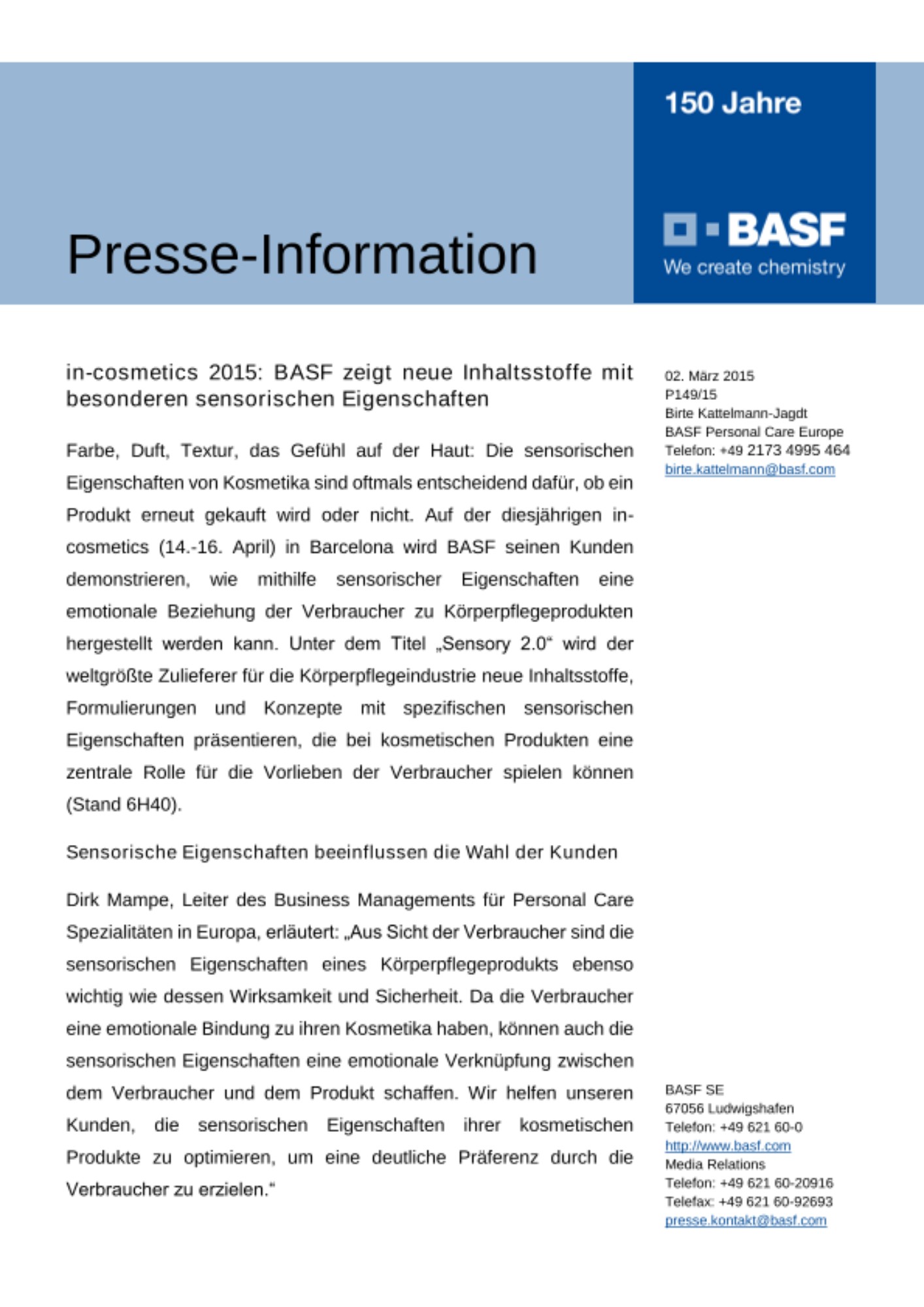 in-cosmetics 2015: BASF zeigt neue Inhaltsstoffe mit besonderen sensorischen Eigenschaften