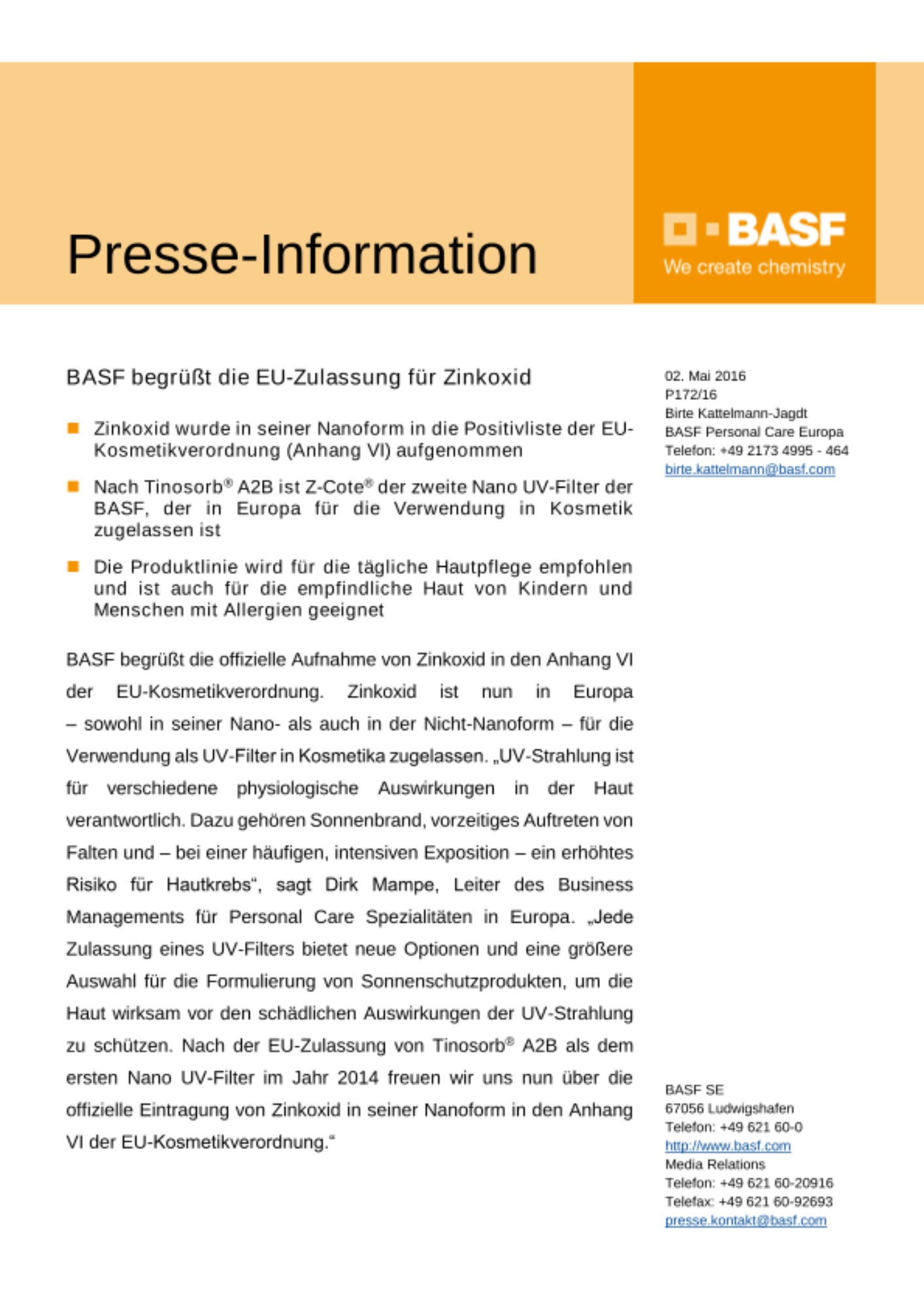 – sowohl in seiner Nano- als auch in der Nicht-Nanoform – für die Verwendung als UV-Filter in Kosmetika zugelassen. „UV-Strahlung ist für verschiedene physiologische Auswirkungen in der Haut verantwortlich. Dazu gehören Sonnenbrand, vorzeitiges Auftreten von Falten und – bei einer häufigen, intensiven Exposition – ein erhöhtes Risiko für Hautkrebs“, sagt Dirk Mampe, Leiter des Business Managements für Personal Care Spezialitäten in Europa. „Jede Zulassung eines UV-Filters bietet neue Optionen und eine größere Auswahl für die Formulierung von Sonnenschutzprodukten, um die Haut wirksam vor den schädlichen Auswirkungen der UV-Strahlung zu schützen. Nach der EU-Zulassung von Tinosorb® A2B als dem ersten Nano UV-Filter im Jahr 2014 freuen wir uns nun über die offizielle Eintragung von Zinkoxid in seiner Nanoform in den Anhang VI der EU-Kosmetikverordnung.“