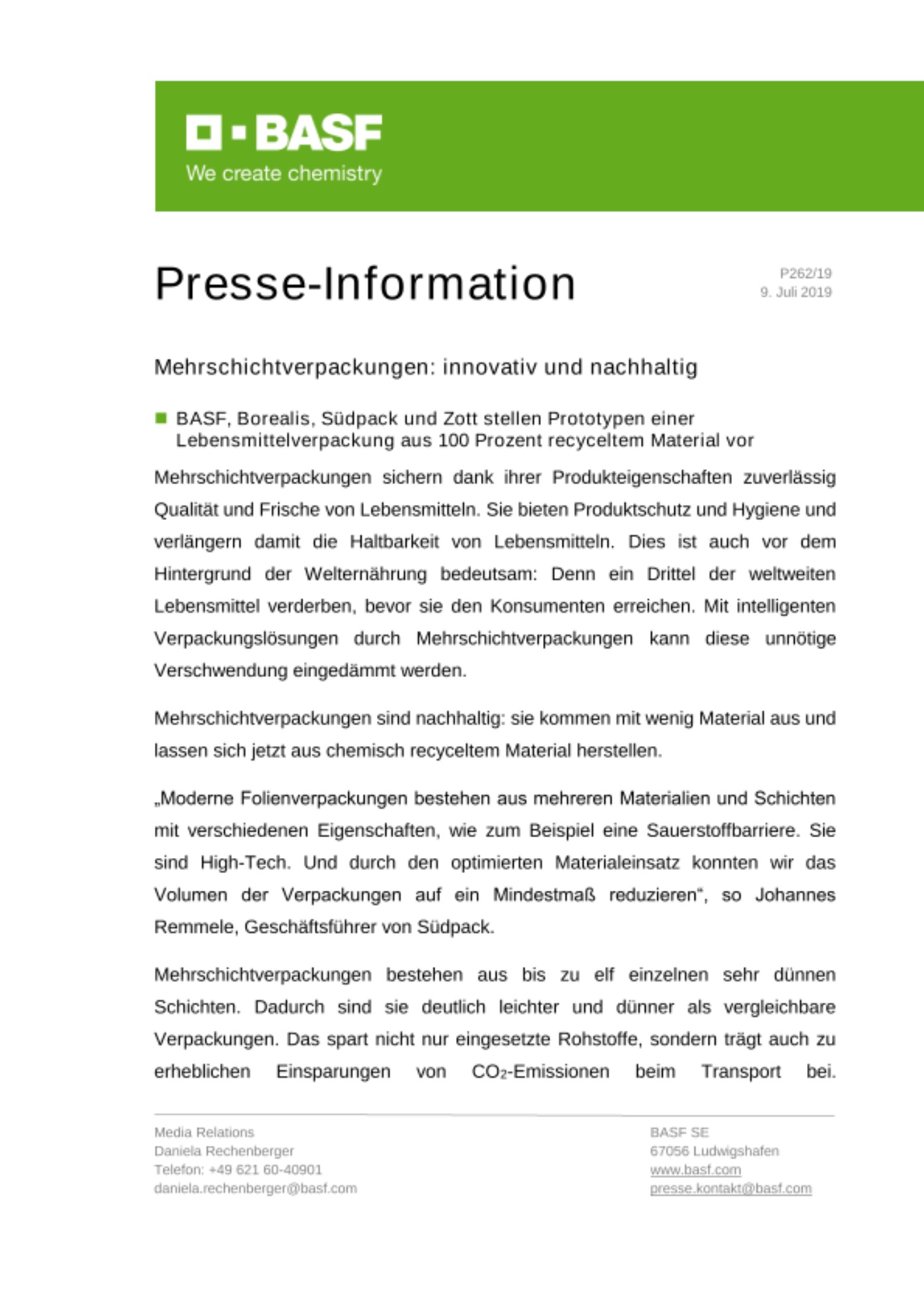 - BASF, Borealis, Südpack und Zott stellen Prototypen einer Lebensmittelverpackung aus 100 Prozent recyceltem Material vor