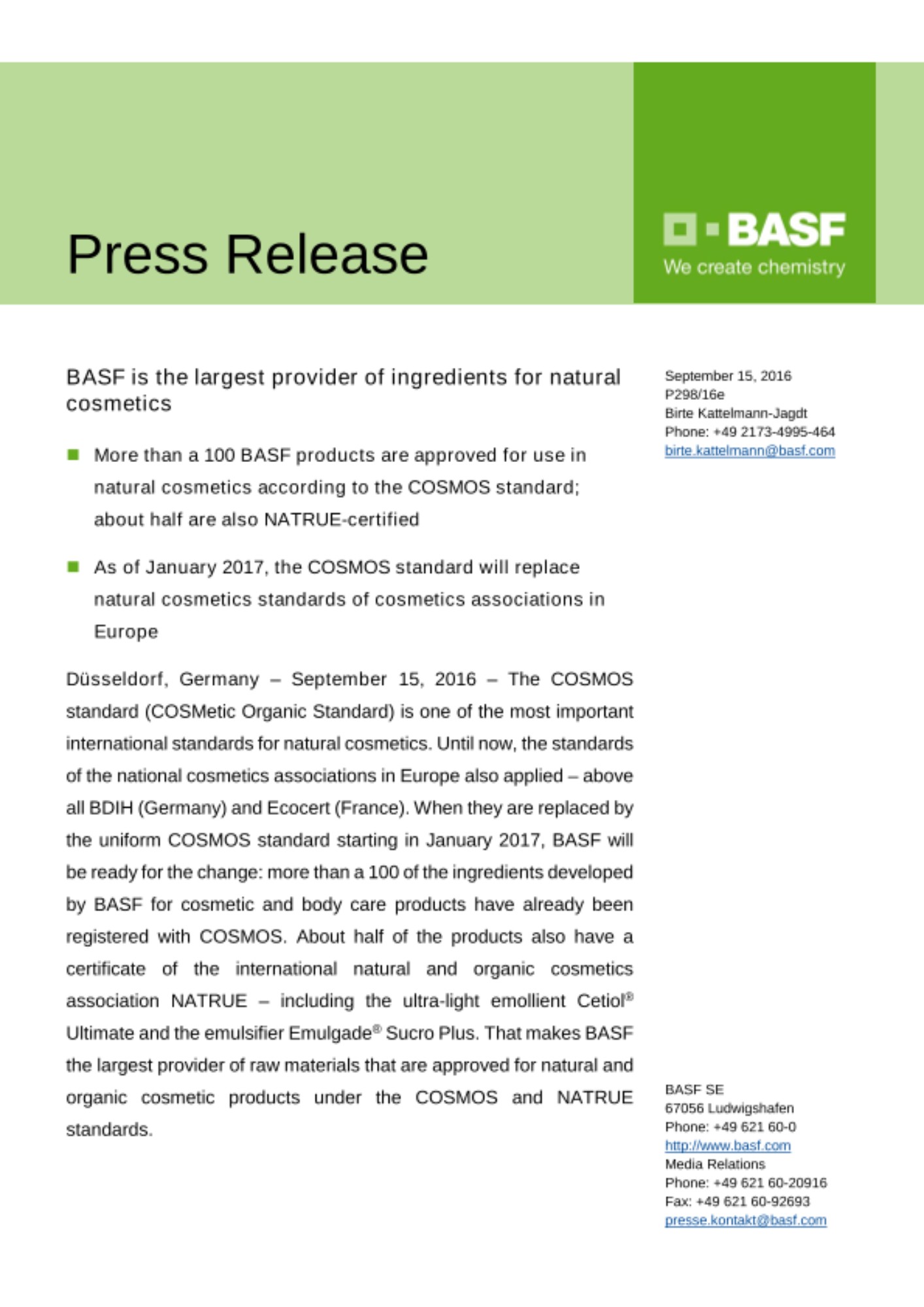 Düsseldorf, Germany – September 15, 2016 – The COSMOS standard (COSMetic Organic Standard) is one of the most important international standards for natural cosmetics. Until now, the standards of the national cosmetics associations in Europe also applied – above all BDIH (Germany) and Ecocert (France). When they are replaced by the uniform COSMOS standard starting in January 2017, BASF will be ready for the change: more than a 100 of the ingredients developed by BASF for cosmetic and body care products have already been registered with COSMOS. About half of the products also have a certificate of the international natural and organic cosmetics association NATRUE – including the ultra-light emollient Cetiol® Ultimate and the emulsifier Emulgade® Sucro Plus. That makes BASF the largest provider of raw materials that are approved for natural and organic cosmetic products under the COSMOS and NATRUE standards.