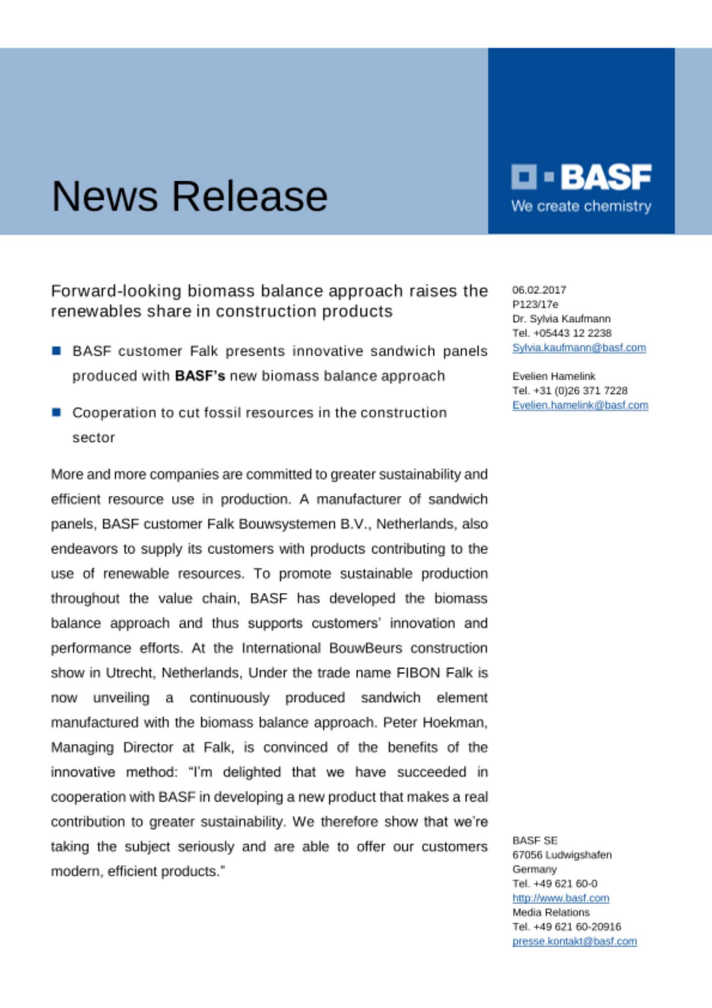 - BASF customer Falk presents innovative sandwich panels produced with BASF’s new biomass balance approach