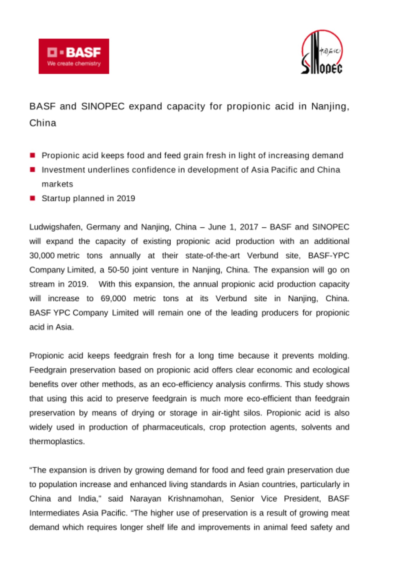 Ludwigshafen, Germany and Nanjing, China – June 1, 2017 – BASF and SINOPEC will expand the capacity of existing propionic acid production with an additional 30,000 metric tons annually at their state-of-the-art Verbund site, BASF-YPC Company Limited, a 50-50 joint venture in Nanjing, China. The expansion will go on stream in 2019. With this expansion, the annual propionic acid production capacity will increase to 69,000 metric tons at its Verbund site in Nanjing, China. BASF YPC Company Limited will remain one of the leading producers for propionic acid in Asia.