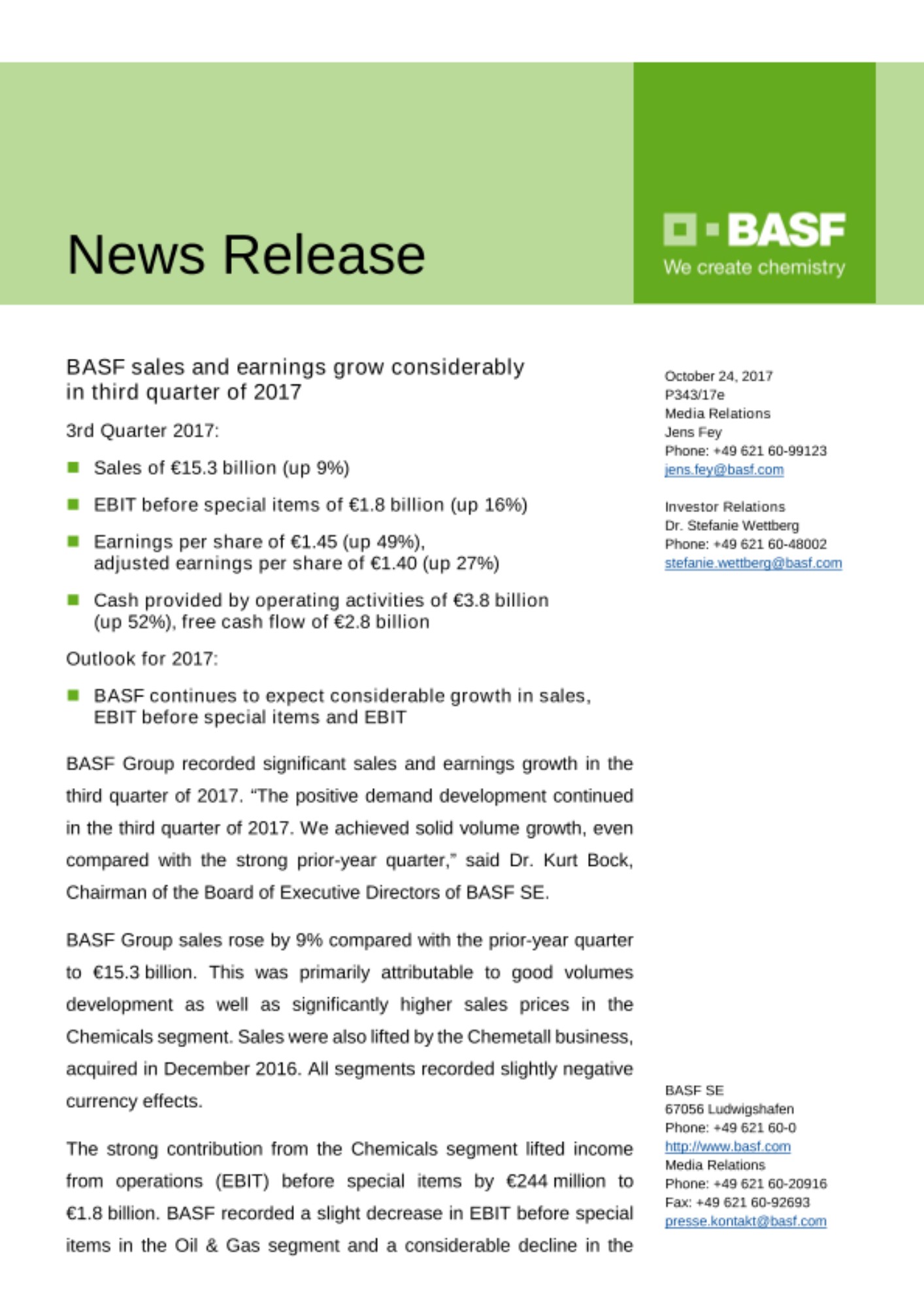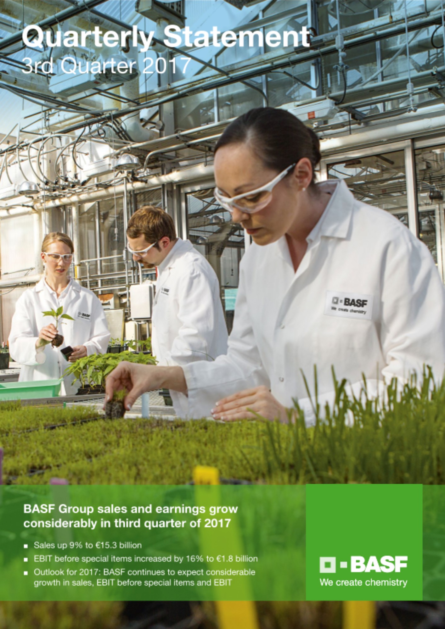 BASF Group recorded significant sales and earnings growth in the third quarter of 2017. “The positive demand development continued in the third quarter of 2017. We achieved solid volume growth, even compared with the strong prior-year quarter,” said Dr. Kurt Bock, Chairman of the Board of Executive Directors of BASF SE.