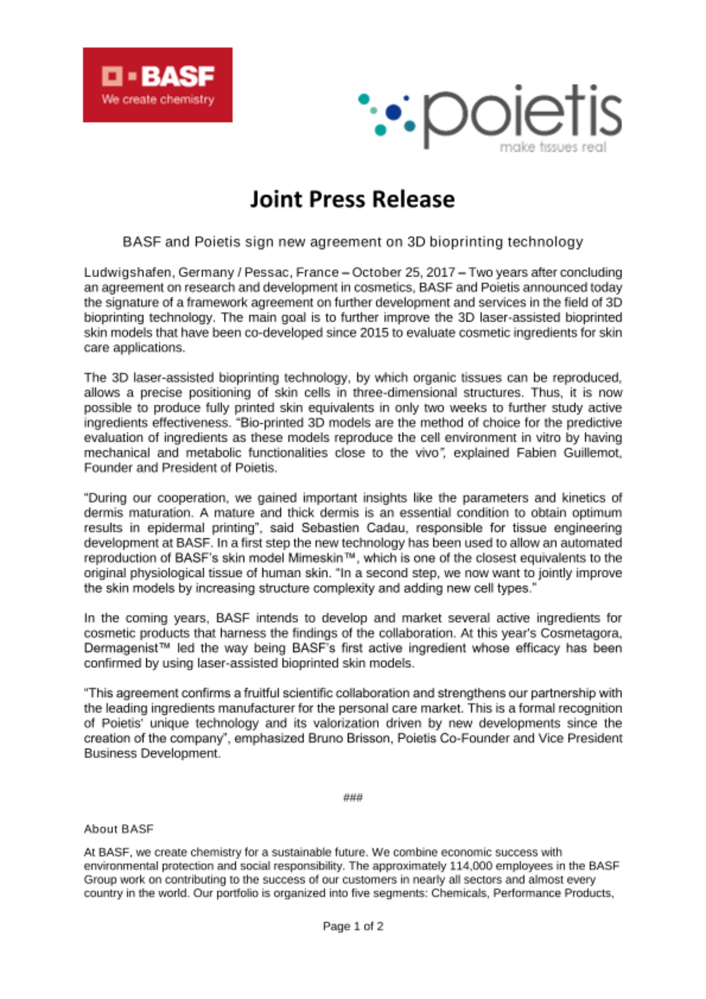 Ludwigshafen, Germany / Pessac, France – October 25, 2017 – Two years after concluding an agreement on research and development in cosmetics, BASF and Poietis announced today the signature of a framework agreement on further development and services in the field of 3D bioprinting technology. The main goal is to further improve the 3D laser-assisted bioprinted skin models that have been co-developed since 2015 to evaluate cosmetic ingredients for skin care applications.