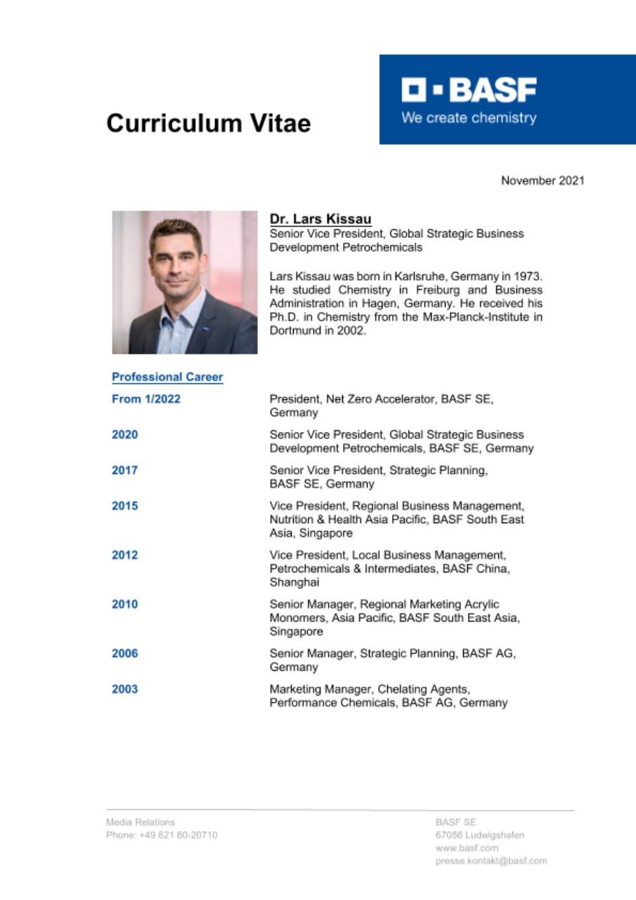 The Net Zero Accelerator unit will be led by Dr. Lars Kissau (48) as President, reporting directly to the Chairman of the Board of Executive Directors. Under Kissau’s leadership, existing and new projects to achieve the CO2 reduction targets will be launched and driven forward at corporate level worldwide in the future. The aim is to move the projects into the implementation phase over the next few years. By pooling expertise around renewable energies, alternative raw materials and CO2 reduction technologies, BASF will increase the speed of implementation and achieve scaling effects more quickly, thus making an important contribution to climate protection. In parallel, the operating divisions will continue to work on divisional projects to implement BASF’s ambitious CO2 reduction targets.