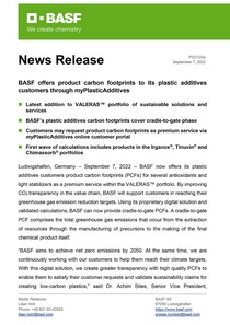 Ludwigshafen, Germany – September 7, 2022 – BASF now offers its plastic additives customers product carbon footprints (PCFs) for several antioxidants and light stabilizers as a premium service within the VALERAS™ portfolio. By improving CO2 transparency in the value chain, BASF will support customers in reaching their greenhouse gas emission reduction targets. Using its proprietary digital solution and validated calculations, BASF can now provide cradle-to-gate PCFs. A cradle-to-gate PCF comprises the total greenhouse gas emissions that occur from the extraction of resources through the manufacturing of precursors to the making of the final chemical product itself.