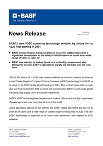 ISELIN, NJ, March 24 – BASF was recently selected by Airbus to develop and supply a new Volatile Organic Compound/Ozone Converter (VOZC) technology from BASF to be used on its A320 Family aircraft starting in 2024. The contract came after a multi-year technical competition that also took into consideration BASF’s world-class global manufacturing, supply chain and quality capabilities.