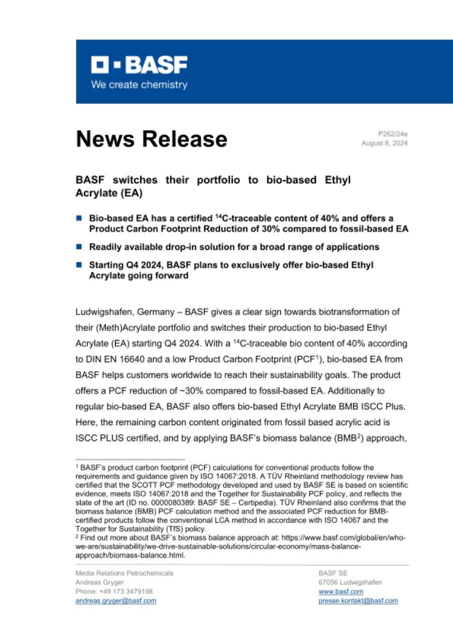 Ludwigshafen, Germany – BASF gives a clear sign towards biotransformation of their (Meth)Acrylate portfolio and switches their production to bio-based Ethyl Acrylate (EA) starting Q4 2024. With a 14C-traceable bio content of 40% according to DIN EN 16640 and a low Product Carbon Footprint (PCF1), bio-based EA from BASF helps customers worldwide to reach their sustainability goals. The product offers a PCF reduction of ~30% compared to fossil-based EA. Additionally to regular bio-based EA, BASF also offers bio-based Ethyl Acrylate BMB ISCC Plus. Here, the remaining carbon content originated from fossil based acrylic acid is ISCC PLUS certified, and by applying BASF’s biomass balance (BMB2) approach, this variant offers a further reduced product carbon footprint.