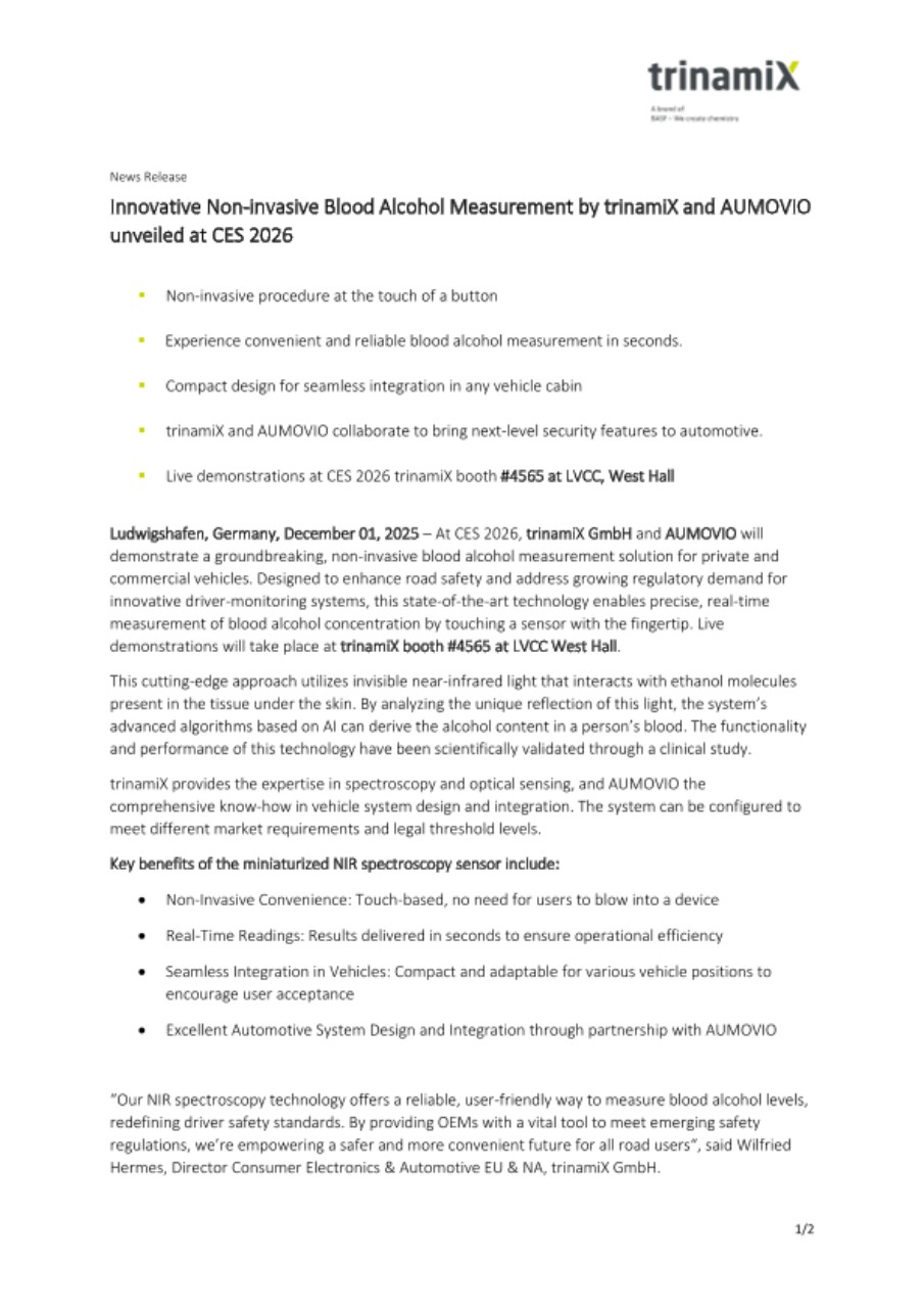 Ludwigshafen, Germany, December 01, 2025 – At CES 2026, trinamiX GmbH and AUMOVIO will demonstrate a groundbreaking, non-invasive blood alcohol measurement solution for private and commercial vehicles. Designed to enhance road safety and address growing regulatory demand for innovative driver-monitoring systems, this state-of-the-art technology enables precise, real-time measurement of blood alcohol concentration by touching a sensor with the fingertip. Live demonstrations will take place at trinamiX booth #4565 at LVCC West Hall.