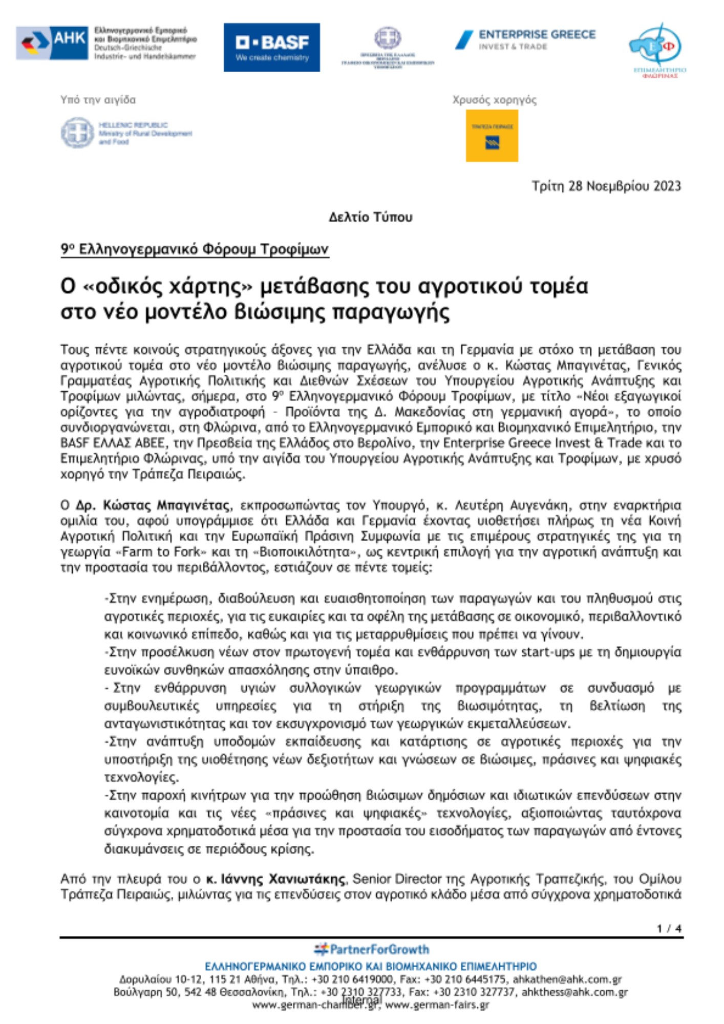 Τους πέντε κοινούς στρατηγικούς άξονες για την Ελλάδα και τη Γερμανία με στόχο τη μετάβαση του αγροτικού τομέα στο νέο μοντέλο βιώσιμης παραγωγής, ανέλυσε ο κ. Κώστας Μπαγινέτας, Γενικός Γραμματέας Αγροτικής Πολιτικής και Διεθνών Σχέσεων του Υπουργείου Αγροτικής Ανάπτυξης και Τροφίμων μιλώντας, σήμερα, στο 9ο Ελληνογερμανικό Φόρουμ Τροφίμων, με τίτλο «Νέοι εξαγωγικοί ορίζοντες για την αγροδιατροφή – Προϊόντα της Δ. Μακεδονίας στη γερμανική αγορά», το οποίο συνδιοργανώνεται, στη Φλώρινα, από το Ελληνογερμανικό Εμπορικό και Βιομηχανικό Επιμελητήριο, την BASF ΕΛΛΑΣ ΑΒΕΕ, την Πρεσβεία της Ελλάδος στο Βερολίνο, την Enterprise Greece Invest & Trade και το Επιμελητήριο Φλώρινας, υπό την αιγίδα του Υπουργείου Αγροτικής Ανάπτυξης και Τροφίμων, με χρυσό χορηγό την Τράπεζα Πειραιώς.