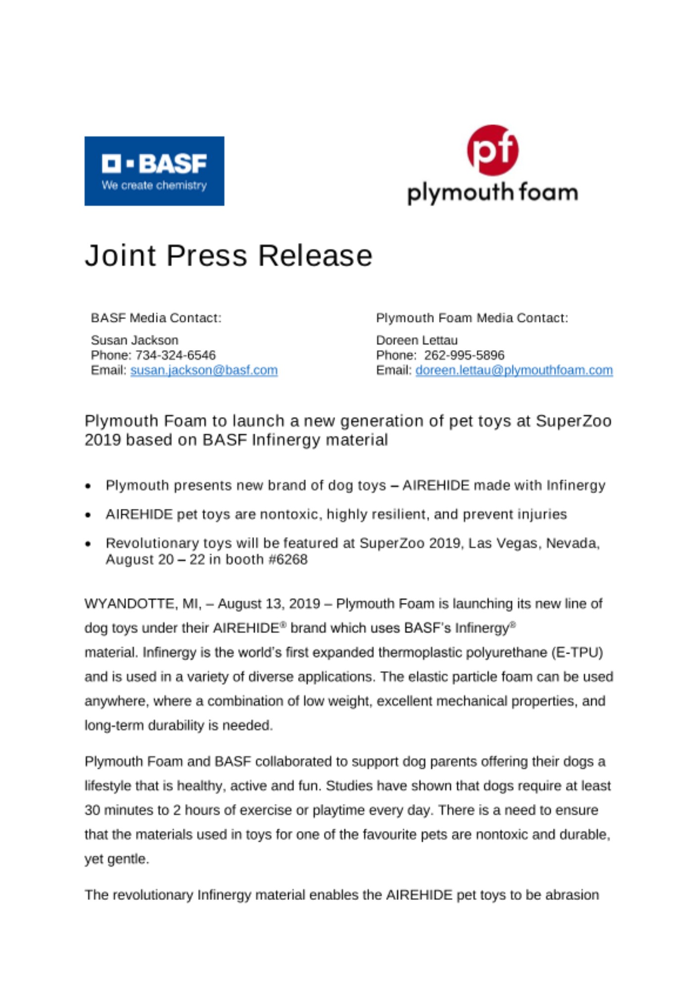 WYANDOTTE, MI, – August 13, 2019 – Plymouth Foam is launching its new line of dog toys under their AIREHIDE® brand which uses BASF’s Infinergy® material. Infinergy is the world’s first expanded thermoplastic polyurethane (E-TPU) and is used in a variety of diverse applications. The elastic particle foam can be used anywhere, where a combination of low weight, excellent mechanical properties, and long-term durability is needed.