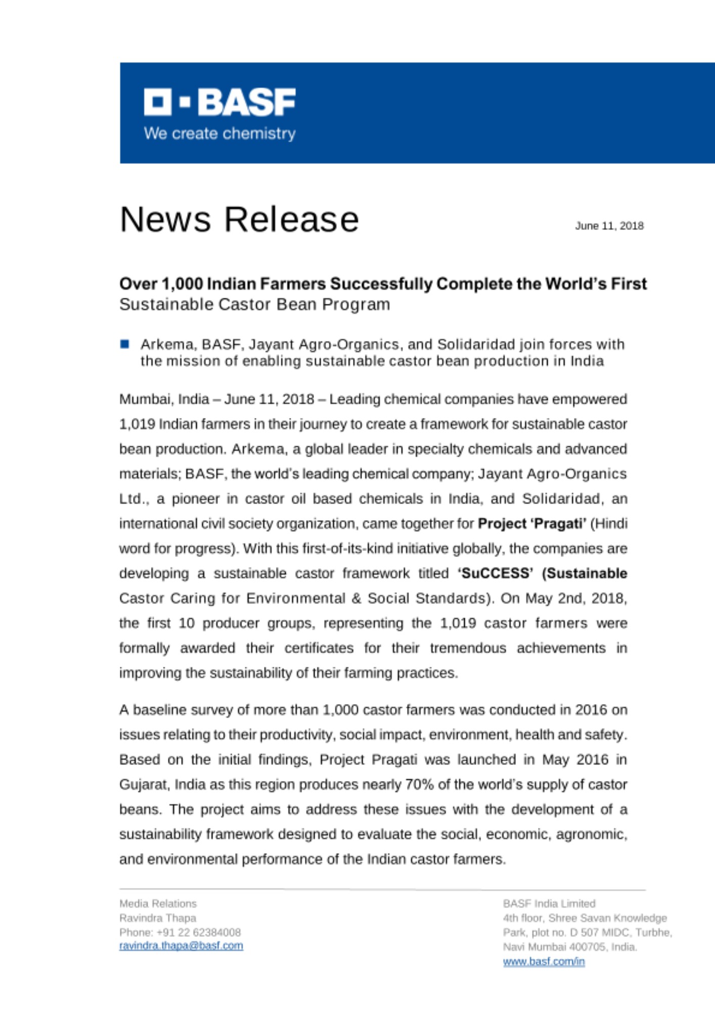 Mumbai, India – June 11, 2018 – Leading chemical companies have empowered 1,019 Indian farmers in their journey to create a framework for sustainable castor bean production. Arkema, a global leader in specialty chemicals and advanced materials; BASF, the world’s leading chemical company; Jayant Agro-Organics Ltd., a pioneer in castor oil based chemicals in India, and Solidaridad, an international civil society organization, came together for Project ‘Pragati’ (Hindi word for progress). With this first-of-its-kind initiative globally, the companies are developing a sustainable castor framework titled ‘SuCCESS’ (Sustainable Castor Caring for Environmental & Social Standards). On May 2nd, 2018, the first 10 producer groups, representing the 1,019 castor farmers were formally awarded their certificates for their tremendous achievements in improving the sustainability of their farming practices.