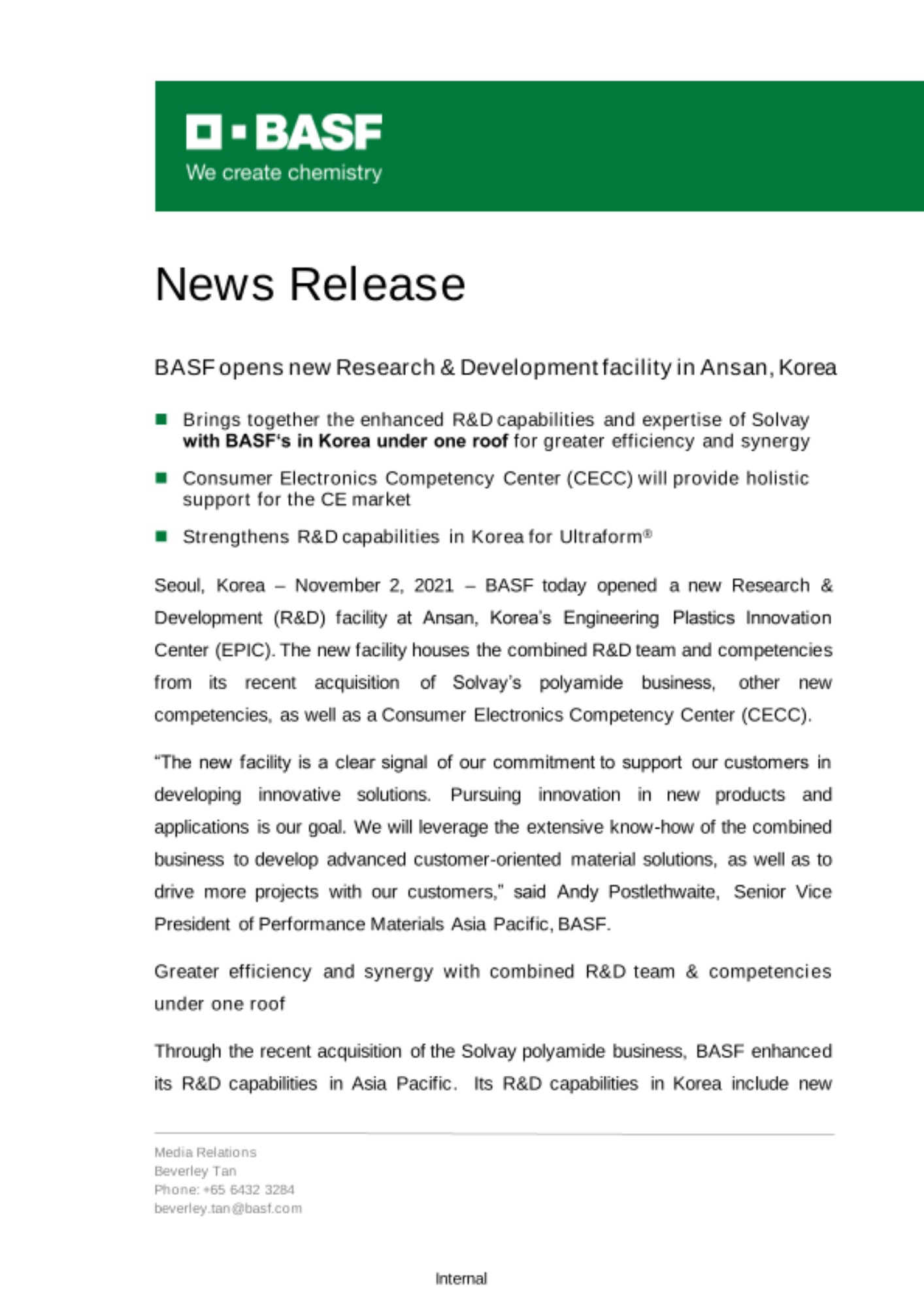 - Brings together the enhanced R&D capabilities and expertise of Solvay with BASF‘s in Korea under one roof for greater efficiency and synergy