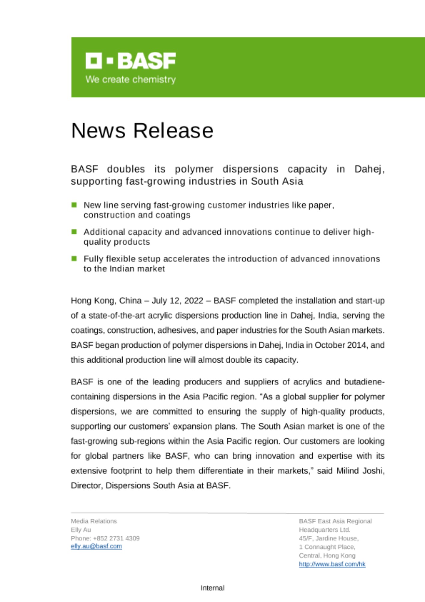 Hong Kong, China – July 12, 2022 – BASF completed the installation and start-up of a state-of-the-art acrylic dispersions production line in Dahej, India, serving the coatings, construction, adhesives, and paper industries for the South Asian markets. BASF began production of polymer dispersions in Dahej, India in October 2014, and this additional production line will almost double its capacity.