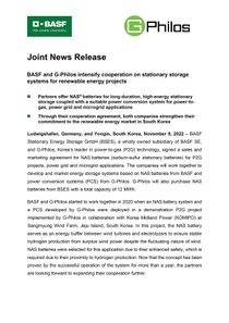 Ludwigshafen, Germany, and Yongin, South Korea, November 9, 2022 – BASF Stationary Energy Storage GmbH (BSES), a wholly owned subsidiary of BASF SE, and G-Philos, Korea’s leader in power-to-gas (P2G) technology, signed a sales and marketing agreement for NAS batteries (sodium-sulfur stationary batteries) for P2G projects, power grid and microgrid applications. The companies will work together to develop and market energy storage systems based on NAS batteries from BASF and power conversion systems (PCS) from G-Philos. G-Philos will also purchase NAS batteries from BSES with a total capacity of 12 MWh.