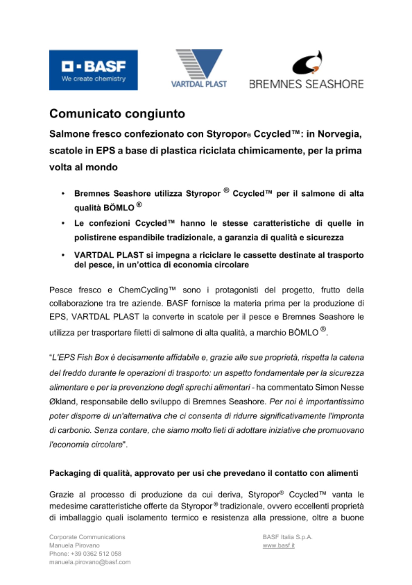 Inoltre, Styropor® Ccycled™ offre a VARTDAL PLAST, uno dei principali produttori norvegesi di EPS, il vantaggio di essere assolutamente identico al materiale tradizionale e di non richiedere, quindi, alcuna modifica al processo di produzione. L'azienda e i suoi prodotti sono certificati secondo il programma di certificazione ecoloop, che attesta l'utilizzo di materiali riciclati al 100% come materia prima. "Bremnes Seashore - ha commentato Jan Endre Vartdal, proprietario e CEO di VARTDAL PLAST - è nostro cliente da decenni e siamo davvero felici che sia stata la prima azienda a scegliere la VARTDAL AIRBOX LOOP: una confezione per prodotti ittici in EPS realizzata al 100% con Styropor ® Ccycled™ derivato da plastica riciclata chimicamente. Il nostro obiettivo – ha aggiunto - è fare in modo che l'intera produzione passi dall'utilizzo di materie prime a base fossile a materie prime non fossili o riciclate. L'utilizzo di Styropor® Ccycled™ di BASF come materia prima ci permette di avviare questa trasformazione in stretta collaborazione con i clienti e, soprattutto, senza scendere a compromessi in termini di qualità e riciclabilità”.