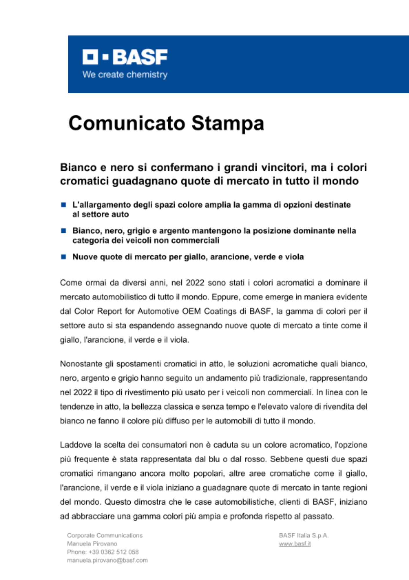 Il BASF Color Report for Automotive OEM Coatings è un'analisi dei dati forniti dalla divisione BASF Coatings e riferiti alla produzione automobilistica globale e all'impiego di vernici sui veicoli leggeri nel 2022.