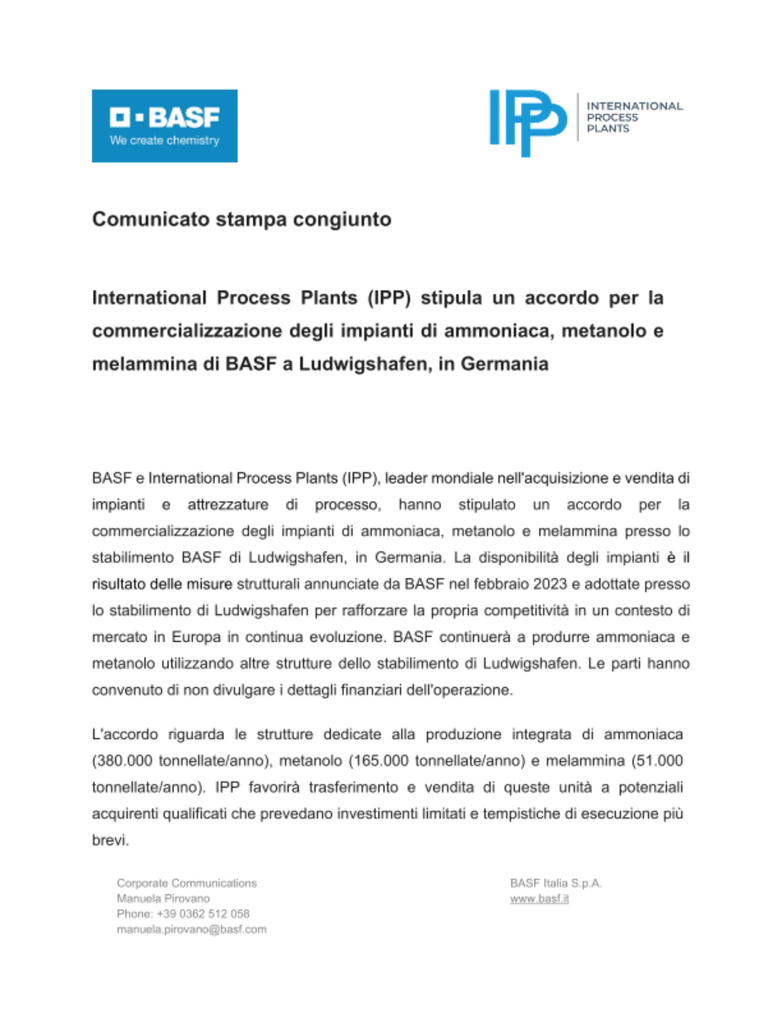 BASF e International Process Plants (IPP), leader mondiale nell'acquisizione e vendita di impianti e attrezzature di processo, hanno stipulato un accordo per la commercializzazione degli impianti di ammoniaca, metanolo e melammina presso lo stabilimento BASF di Ludwigshafen, in Germania. La disponibilità degli impianti è il risultato delle misure strutturali annunciate da BASF nel febbraio 2023 e adottate presso lo stabilimento di Ludwigshafen per rafforzare la propria competitività in un contesto di mercato in Europa in continua evoluzione. BASF continuerà a produrre ammoniaca e metanolo utilizzando altre strutture dello stabilimento di Ludwigshafen. Le parti hanno convenuto di non divulgare i dettagli finanziari dell'operazione.