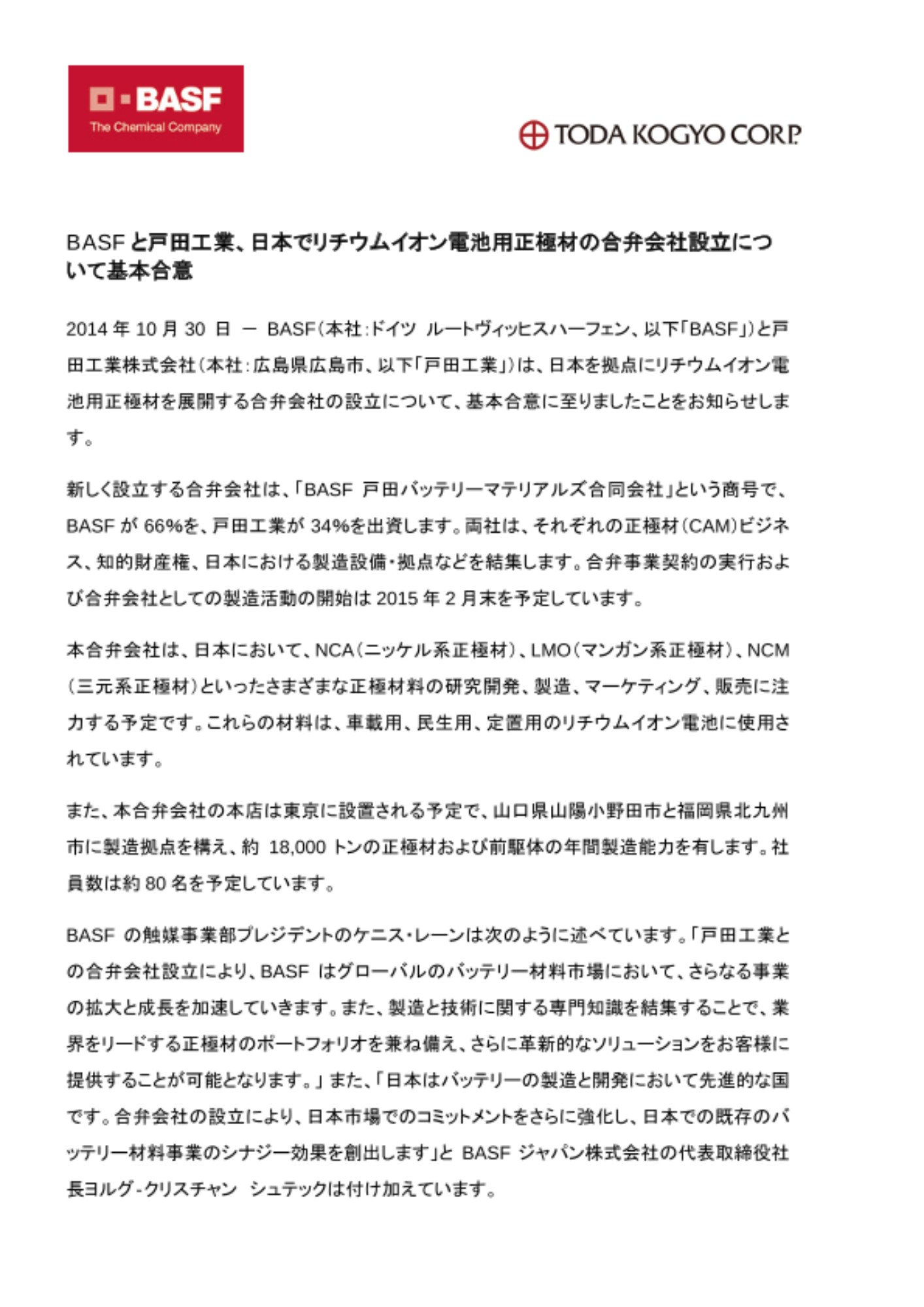 新しく設立する合弁会社は、「 BASF 戸田バッテリーマテリアルズ合同会社」という商号で、 BASF が 66 %を、戸田工業が 34 %を出資します。両社は、 それぞれの正極材( CAM )ビジネス、知的財産権、日本における製造設備・拠点などを結集します。合弁事業契約の実行および合弁会社としての製造活動の開始は 2015 年 2 月末を予定しています。